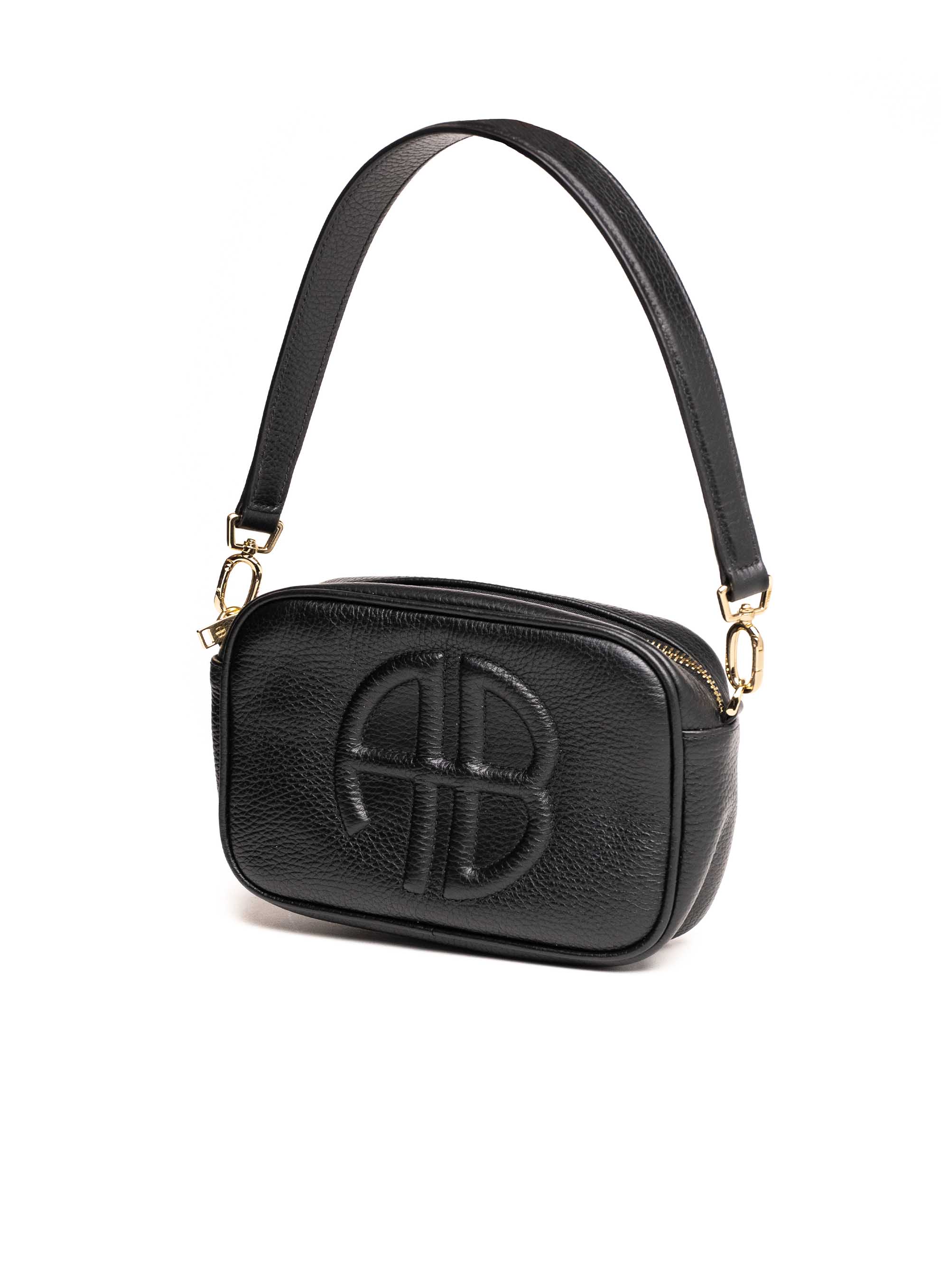 Elegantna i funkcionalna, ova Anine Bing torba izrađena je od visokokvalitetne crne kože s prepoznatljivim reljefnim AB logotipom sprijeda. Kompaktan pravokutni oblik čini je savršenim izborom za svakodnevne prilike, dok zlatni metalni detalji i odvojiva ručka dodaju dašak luksuza. Zatvara se patentnim zatvaračem, a unutrašnjost nudi dovoljno prostora za osnovne potrepštine.