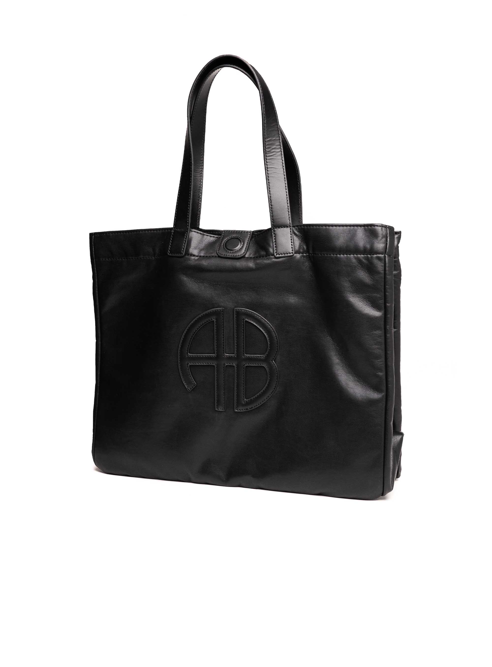 Praktična i elegantna, ova Anine Bing tote torba izrađena je od visokokvalitetne crne kože s prepoznatljivim reljefnim AB logotipom sprijeda. Dizajnirana za svakodnevnu upotrebu, torba nudi dovoljno prostora za sve osnovne potrepštine – od poslovnih dokumenata i laptopa do osobnih stvari.