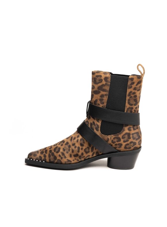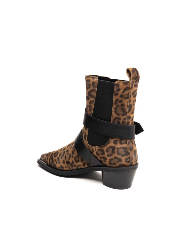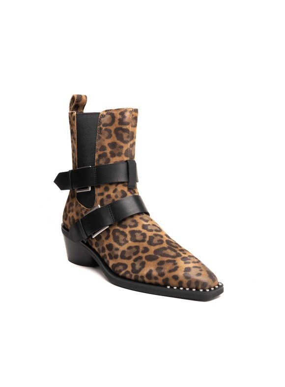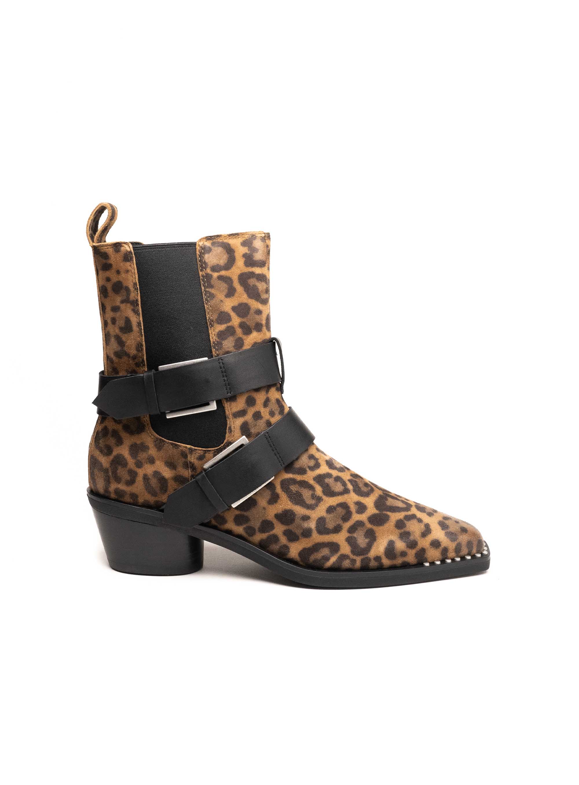 Moderne gležnjače s leopard uzorkom izrađene su od kvalitetne brušene kože i ukrašene crnim kožnim remenima s metalnim kopčama. Kombinacija animal printa i minimalističkih detalja stvara odvažan, ali sofisticiran izgled. Stabilna potpetica i elastični umetci osiguravaju udobnost tijekom nošenja, dok dizajn odiše samopouzdanjem i luksuzom. Savršen izbor za žene koje žele statement komad u svojoj jesensko-zimskoj kolekciji.