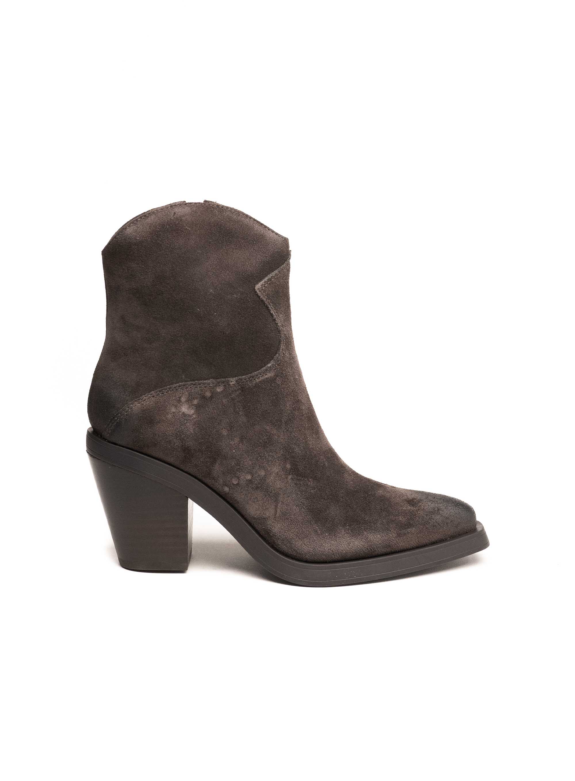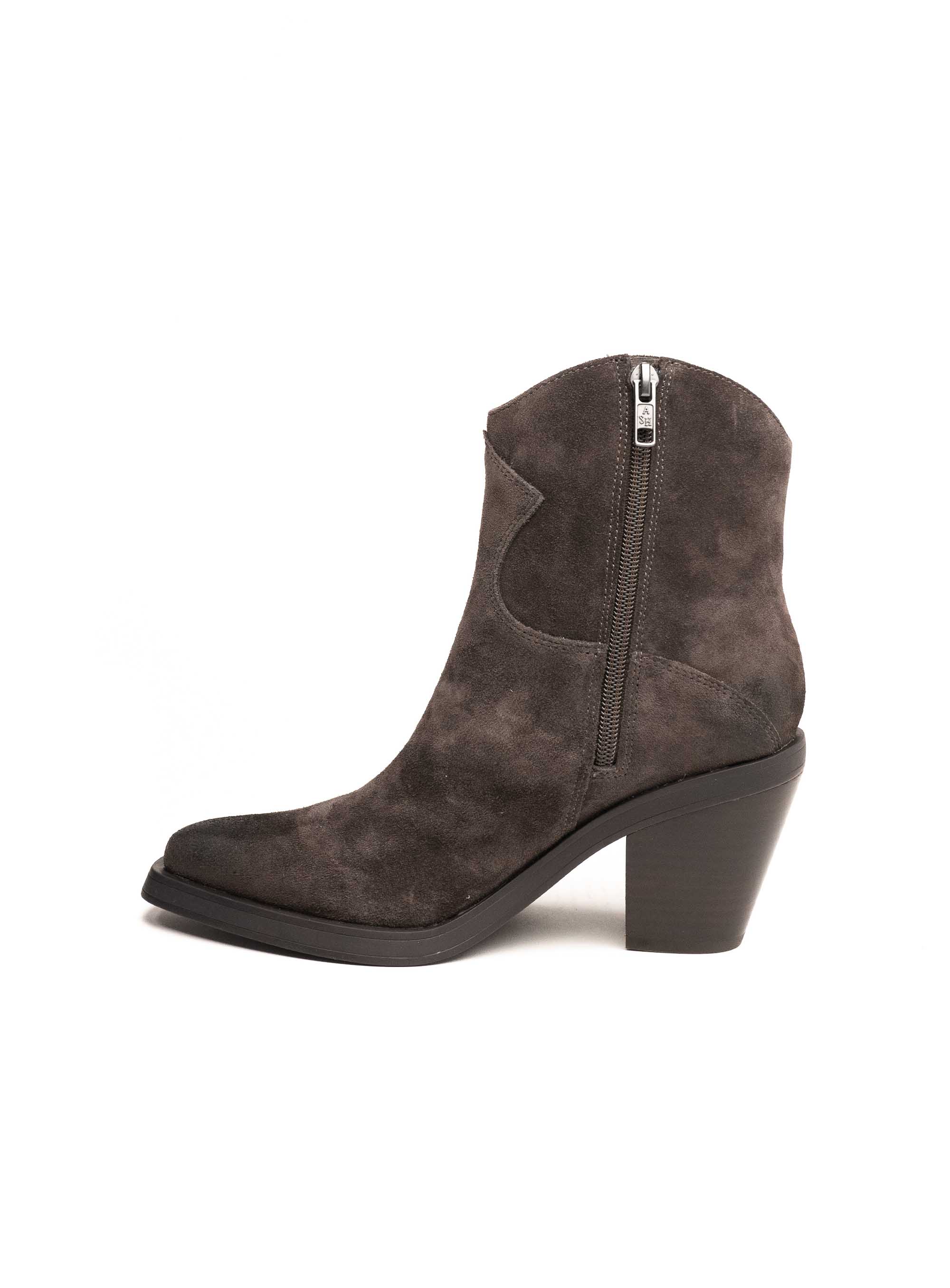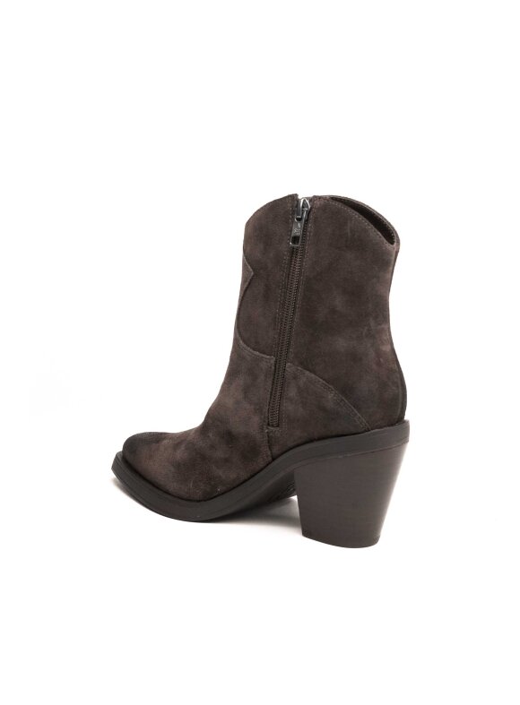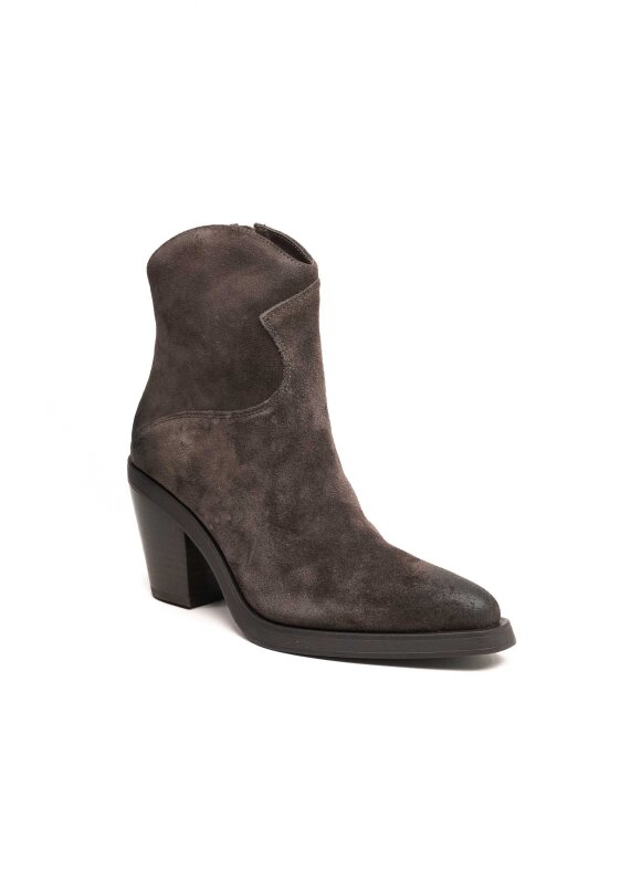 Elegantne ankle čizme izrađene od meke brušene kože u nijansi tamnog antracita donose sofisticiranu interpretaciju klasičnog western stila. Zakrivljeni rub i špicasti vrh naglašavaju ženstvenu siluetu, dok stabilna blok peta pruža savršenu ravnotežu između udobnosti i visine. Savršene su za styling s trapericama, lepršavim haljinama ili oversized kaputima – bezvremenski komad koji podiže svaki outfit.