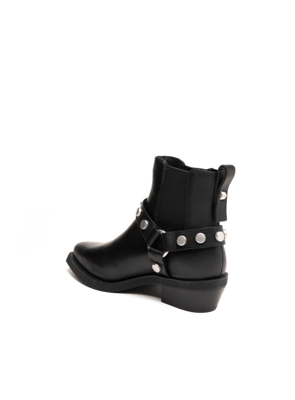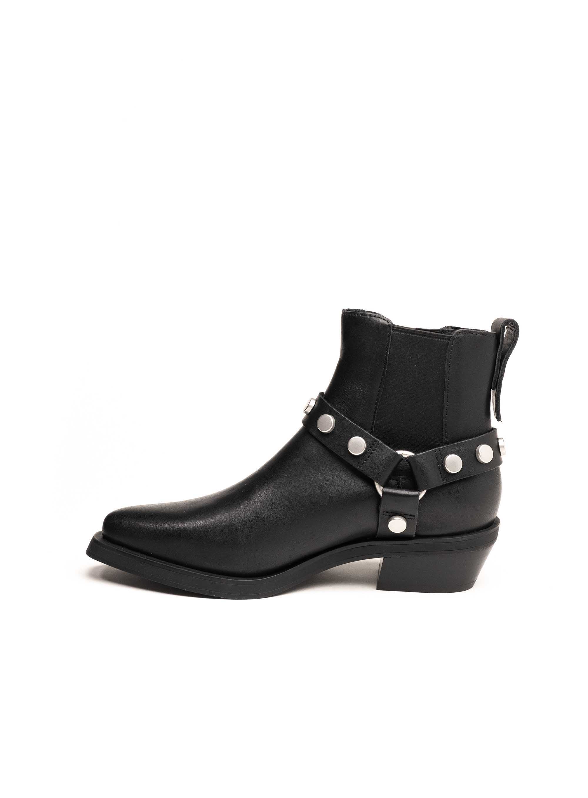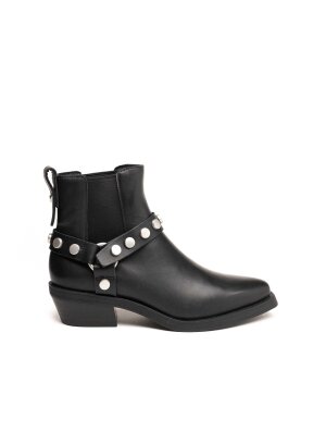 Kožne gležnjače s metalnim zakovicama i ukrasnim remenom inspirirane su klasičnim western i rock stilom. Izrađene od glatke crne kože, ove čizme kombiniraju robusnost i sofisticiranost u savršenom omjeru. Niski blok potpetica i elastični umetci sa strane pružaju udobnost i lakoću pri obuvanju, dok srebrni detalji daju upečatljiv završni dodir svakom outfitu.