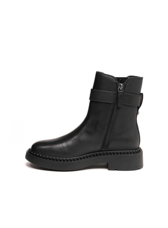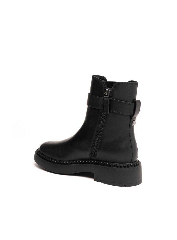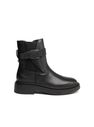 Crne gležnjače od glatke kože donose savršenu ravnotežu između modernog dizajna i praktične udobnosti. Ukrasni kožni remen i diskretna metalna kopča dodaju notu sofisticiranosti, dok gumeni umetci osiguravaju lako obuvanje i fleksibilnost pri hodu. Masivni potplat s decentnim detaljima pruža stabilnost i suvremeni izgled. Idealan model za žene koje traže profinjen, ali snažan modni izraz u svakodnevnim kombinacijama.