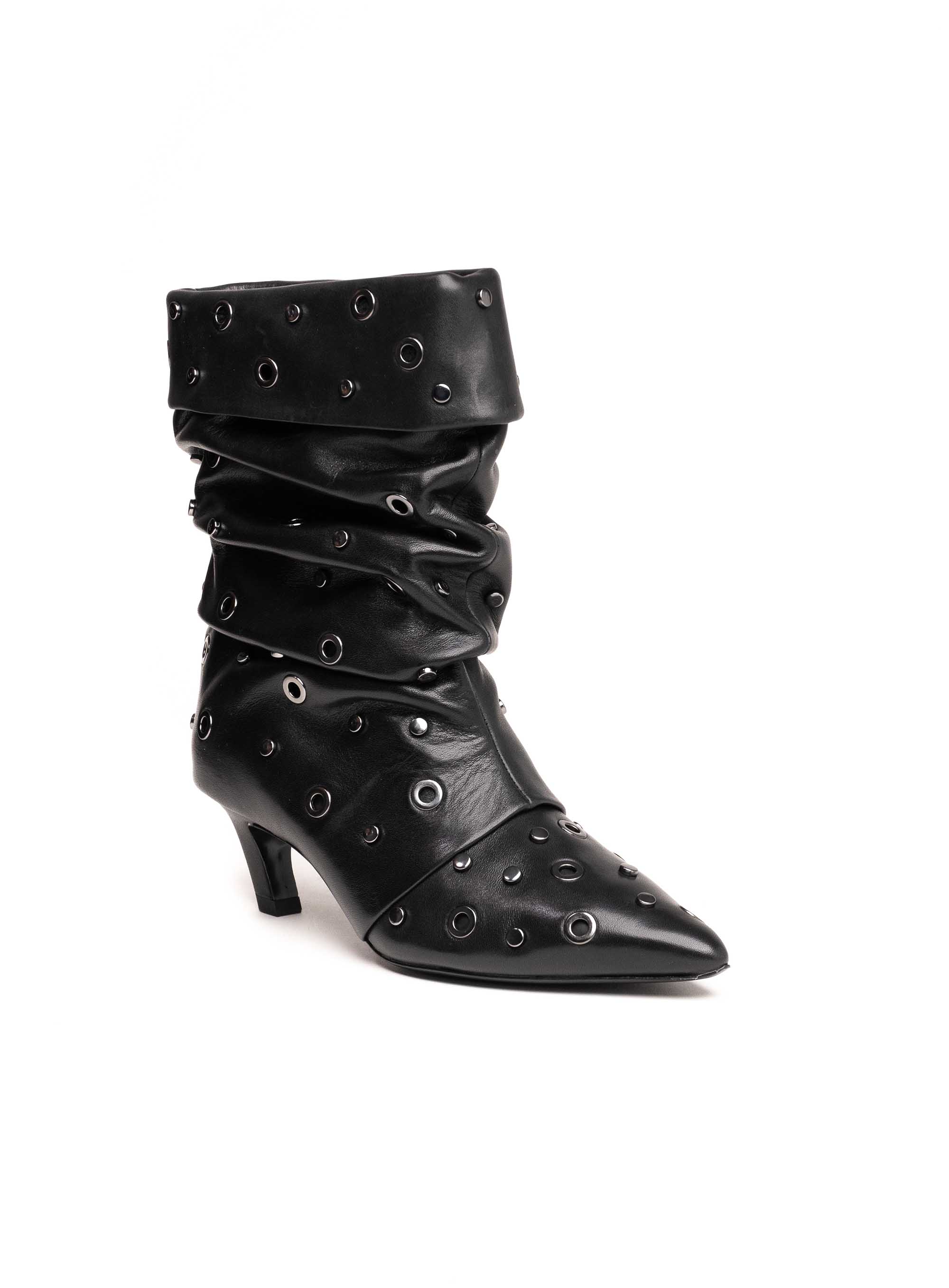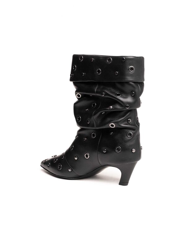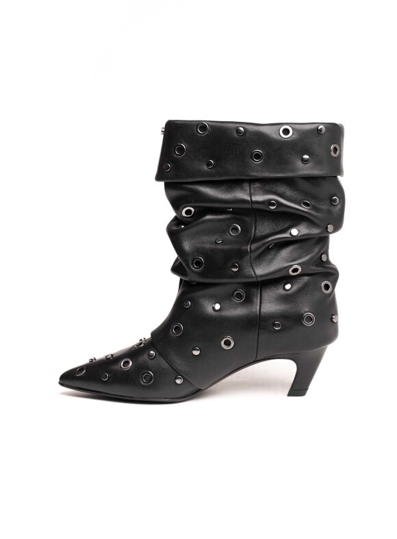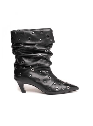 Ash crne gležnjače od glatke kože odlikuju se upečatljivim dizajnom s metalnim nitnama koje daju edgy i moderan izgled. Špicasti vrh i naborani efekt kože naglašavaju ženstvenu siluetu, dok srednje visoka potpetica pruža udobnost i praktičnost. Ove gležnjače savršen su izbor za dame koje žele istaknuti svoj stil kroz odvažan i luksuzan detalj u outfitu.