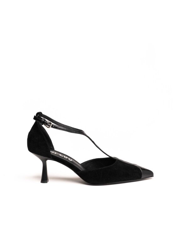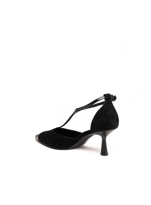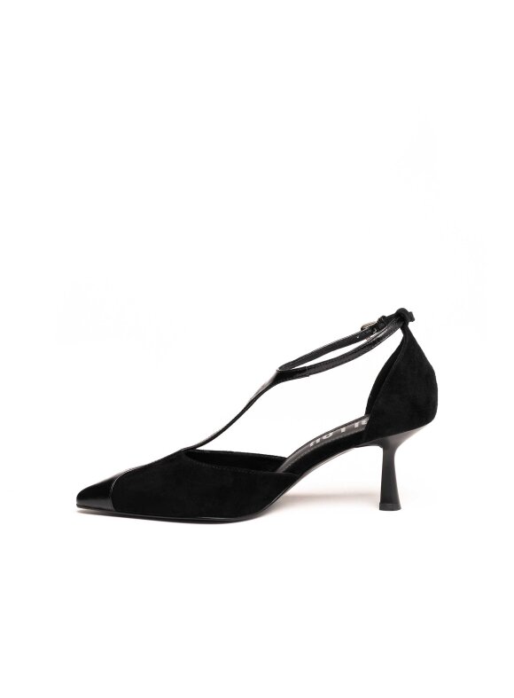 Elegantne i ženstvene cipele izrađene od kombinacije brušene i glatke kože, savršene za svečane i večernje prigode. Model dolazi s tankom potpeticom srednje visine koja vizualno izdužuje nogu, dok remenčić preko rista pruža dodatnu stabilnost i naglašava sofisticiran izgled.