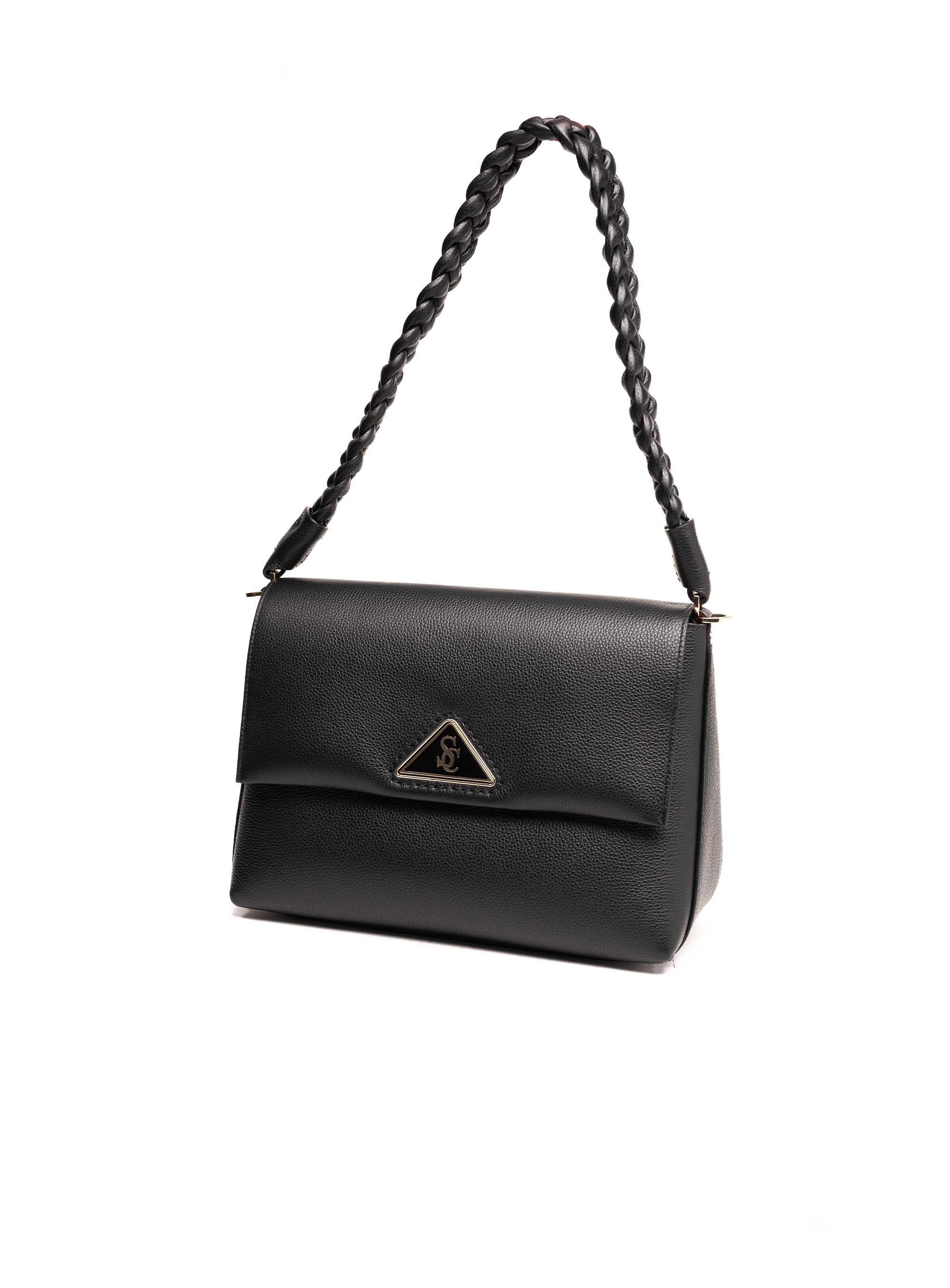 Dizajn odlikuje pletena kožna ručka koja dodaje sofisticiran i moderan izgled, dok metalni logo detalj u zlatnoj boji na prednjoj strani pruža prepoznatljiv pečat luksuza.