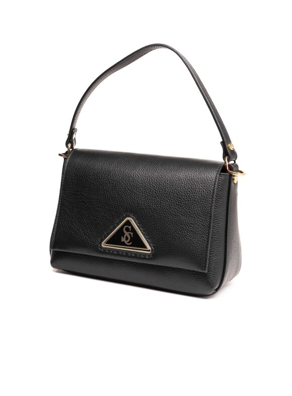 Elegantna torba brenda Carlo Salvatelli izrađena je od visokokvalitetne prirodne kože u klasičnoj crnoj boji. Ovaj model odlikuje minimalistički, ali luksuzan dizajn s prepoznatljivim metalnim logom u zlatnom tonu na prednjoj strani.