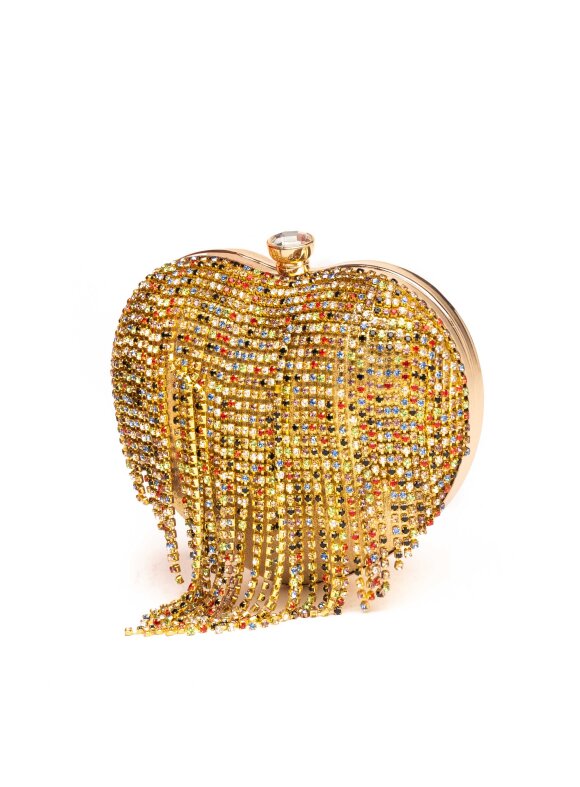 Ekskluzivna Diva torbica u obliku clutch modela izrađena je od metala i ukrašena mnoštvom sjajnih kamenčića u zlatnoj i višebojnoj kombinaciji. Resice koje se prelijevaju preko prednje strane torbice daju joj raskošan i glamurozan izgled, savršen za posebne prigode i večernje izlaske.