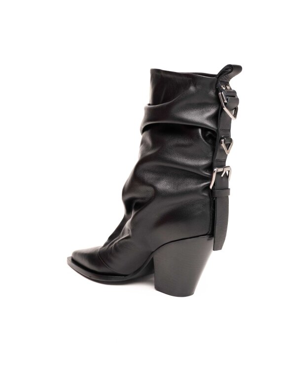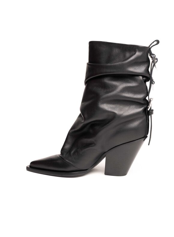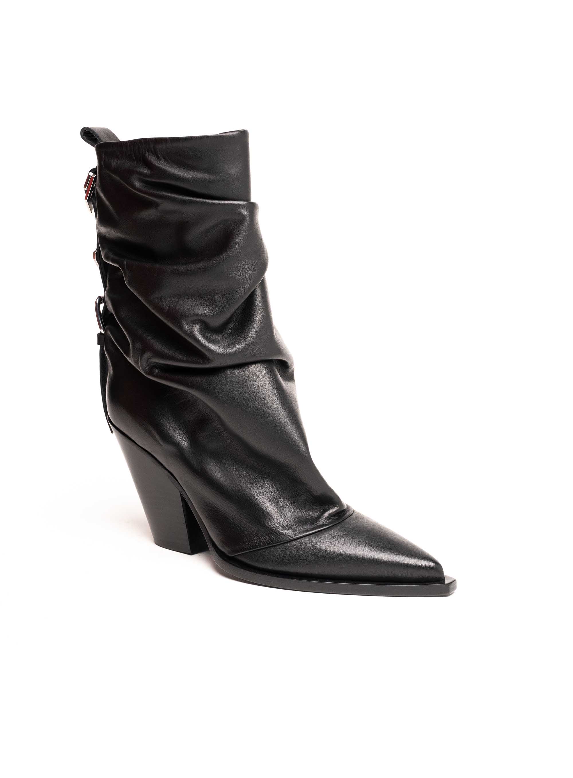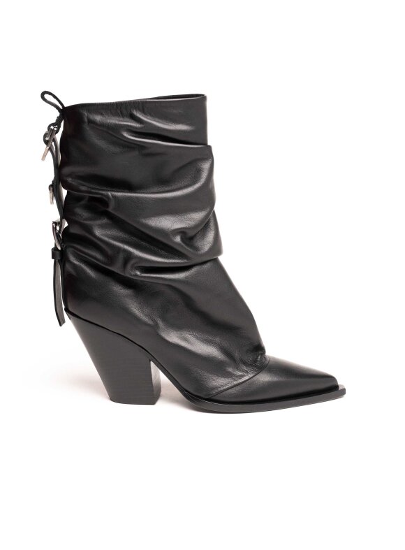 Moderan i odvažan model koji spaja eleganciju i urbani stil. Izrađene od visokokvalitetne kože, ove čizme dolaze s karakterističnim naboranim dizajnom oko gležnja, špicastim vrhom i stabilnom kockastom potpeticom koja pruža udobnost i istovremeno dodatno izdužuje siluetu. Stražnje vezice s metalnim detaljima dodaju dozu unikatnog šarma i modernog karaktera.