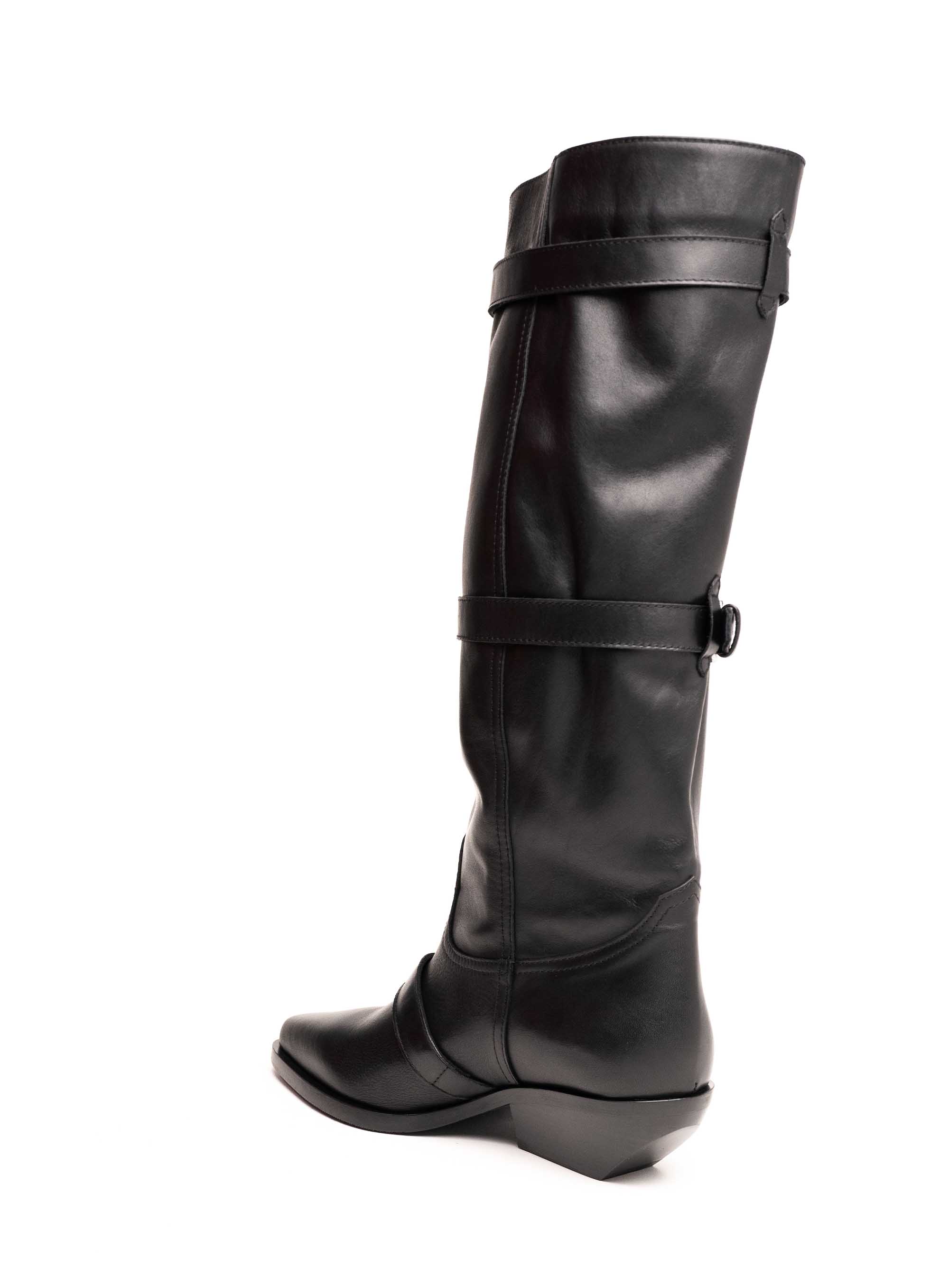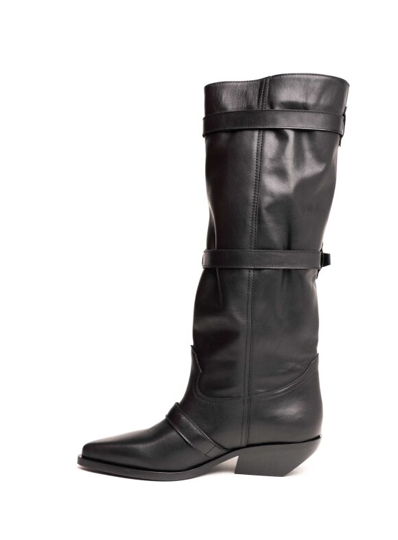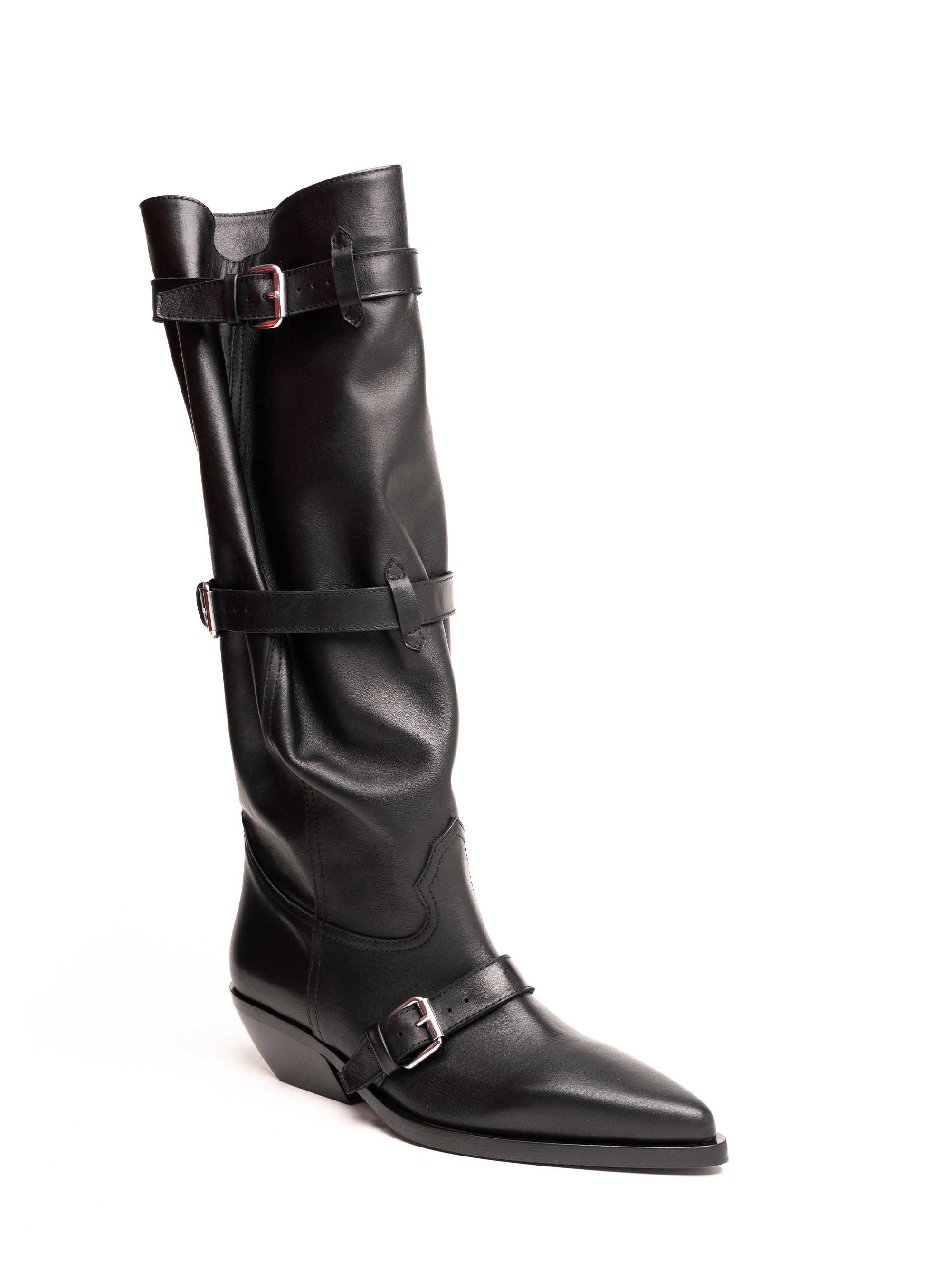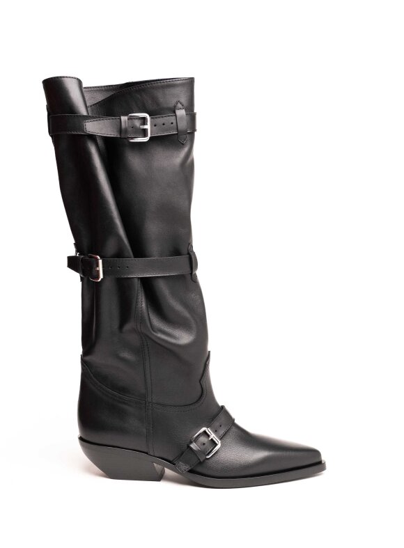 Stilski upečatljive i moderne čizme izrađene od kvalitetne prirodne kože. Model dolazi s višestrukim remenima i metalnim kopčama koje naglašavaju urbani i edgy karakter. Vrh i stabilna potpetica u cowboy stilu čine ih istovremeno elegantnima i praktičnima za svakodnevno nošenje. Mekana koža omogućuje udobnost, a detalji s kopčama daju im jedinstven i prepoznatljiv izgled.
