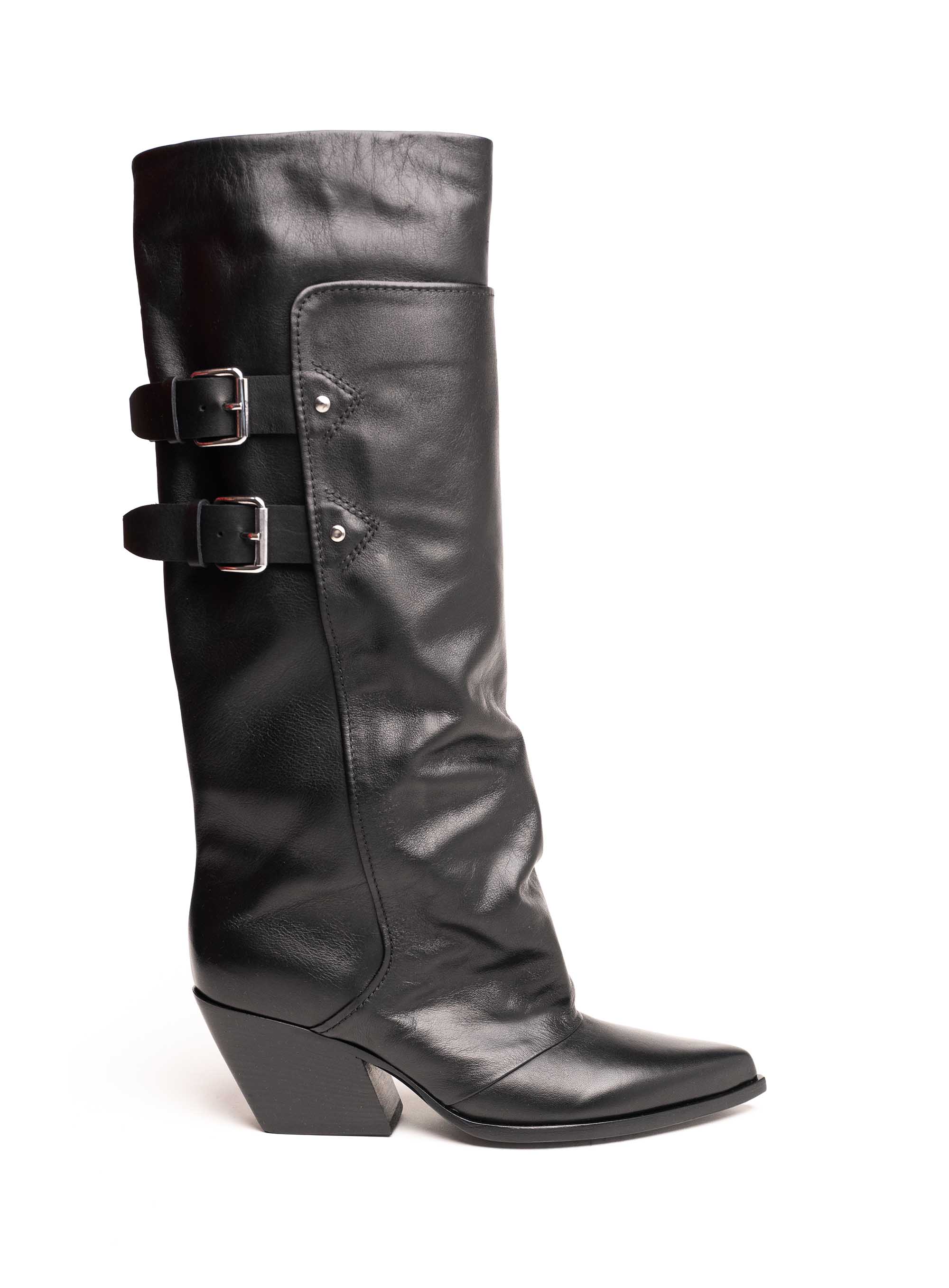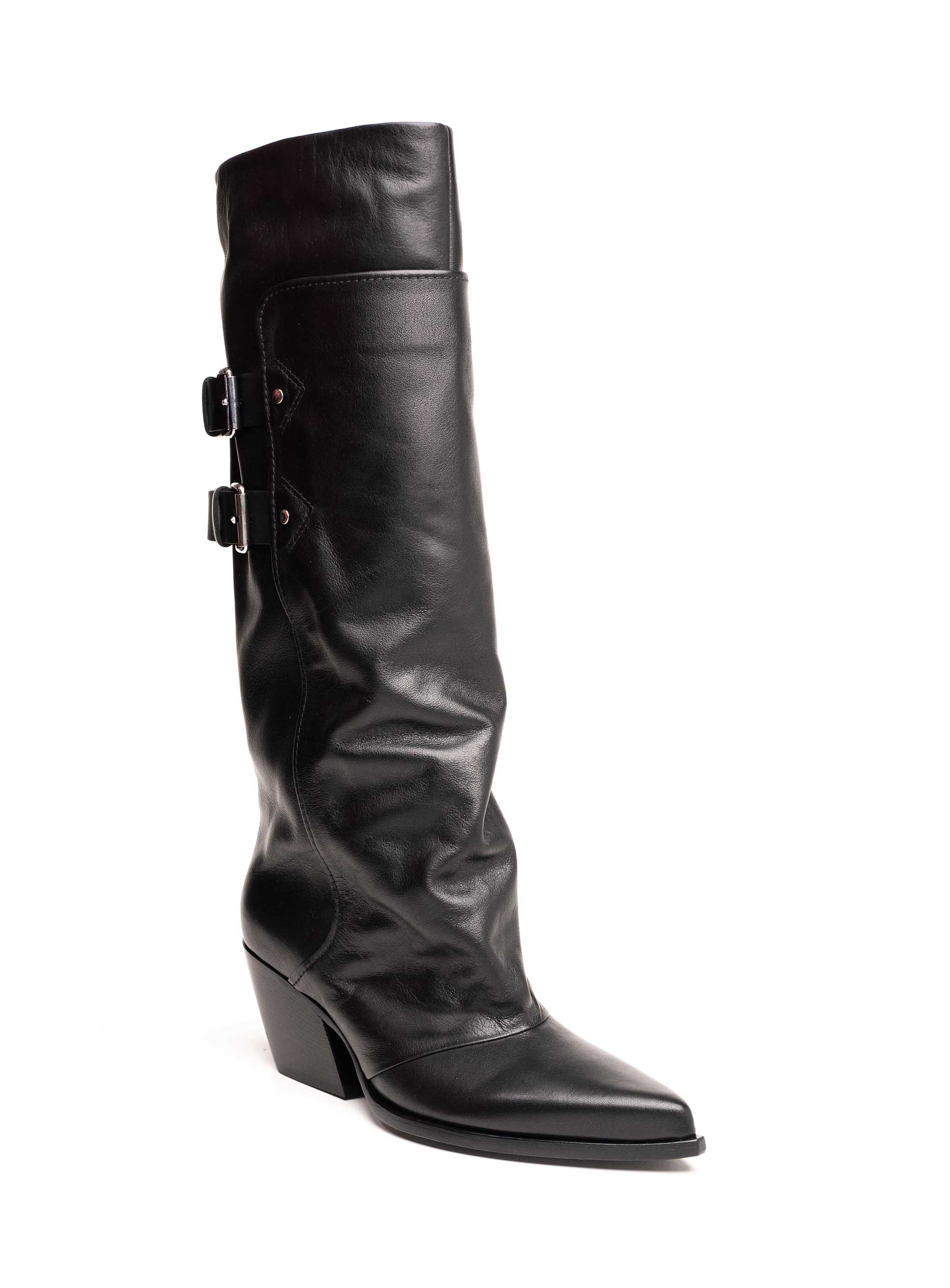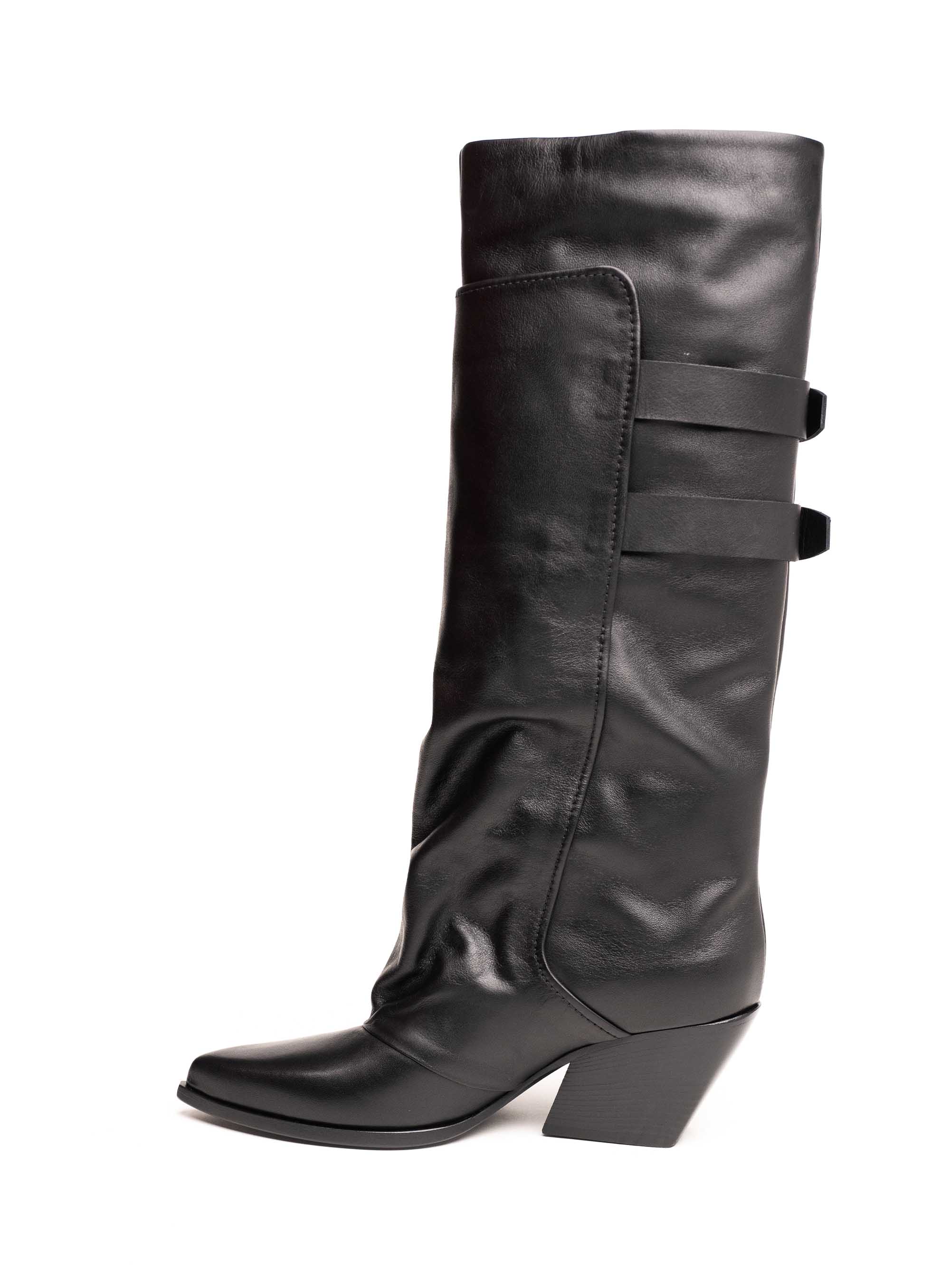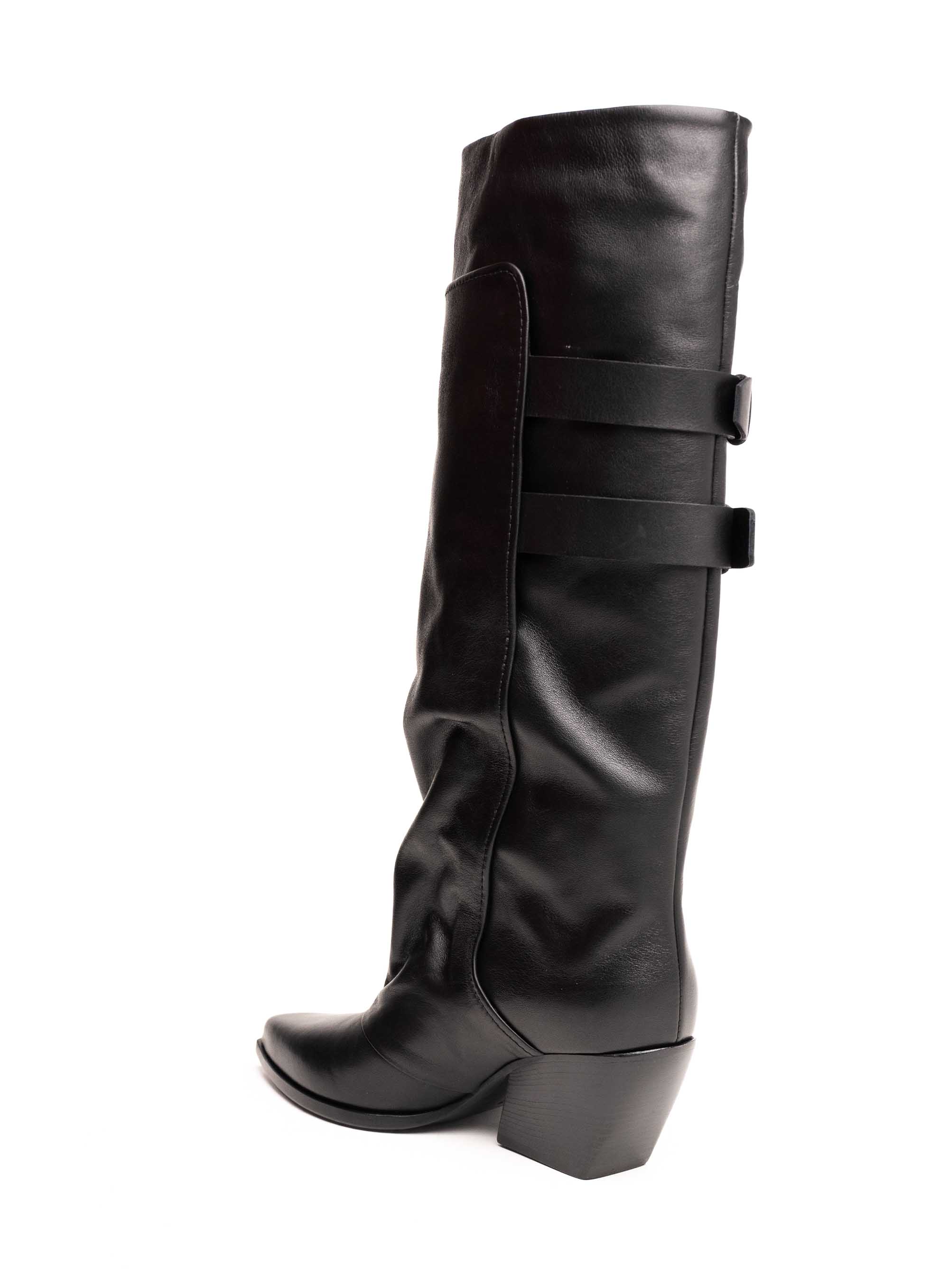 Moderne i odvažne visoke čizme izrađene od prirodne kože vrhunske kvalitete. Ističu se robusnim dizajnom s dvostrukim remenima i metalnim kopčama koje naglašavaju edgy i urbani stil. Stabilna potpetica u cowboy stilu i vrh pružaju savršen balans između elegancije i udobnosti. Idealne su za žene koje žele istaknuti svoj outfit snažnim statement komadom.
