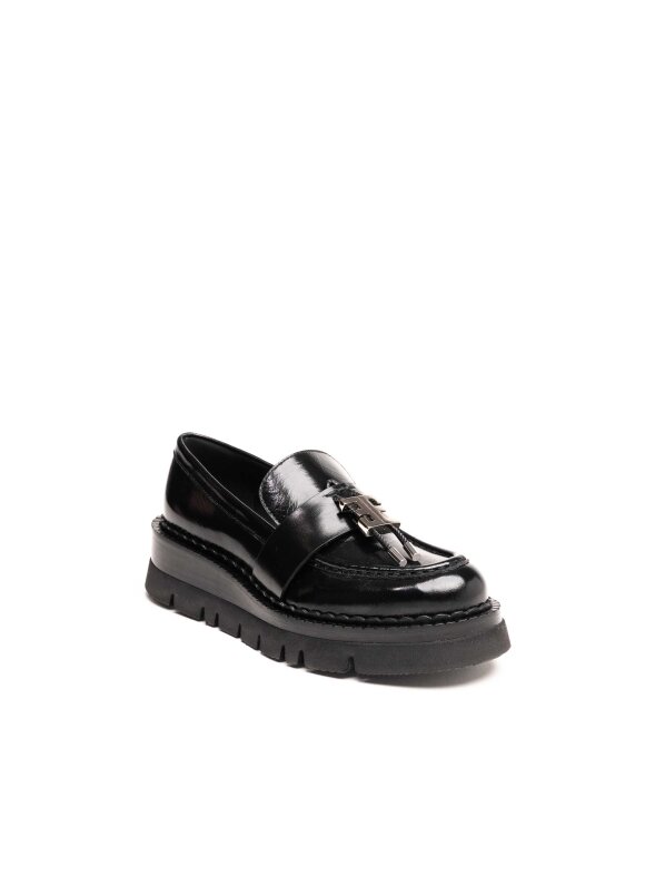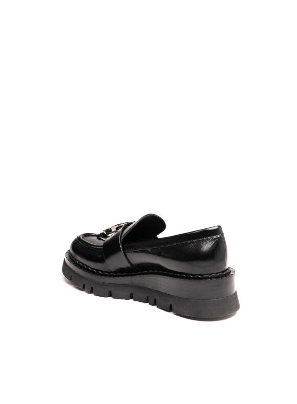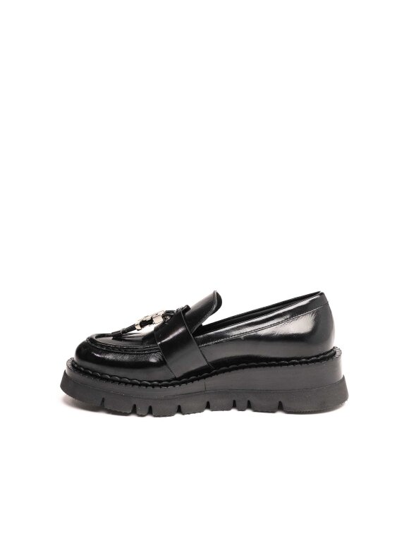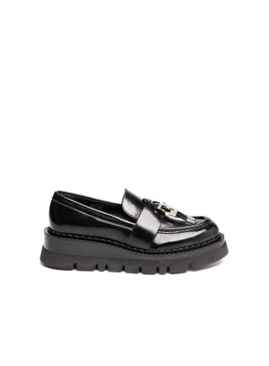 Klasične mokasine u modernoj izvedbi izrađene od sjajne prirodne kože u crnoj boji. Ovaj model krasi robustan gumeni potplat koji pruža stabilnost i udobnost, dok metalni ukras na gornjem dijelu dodaje dozu sofisticiranosti i luksuza. Idealne su za svakodnevne modne kombinacije koje traže spoj elegancije i praktičnosti.