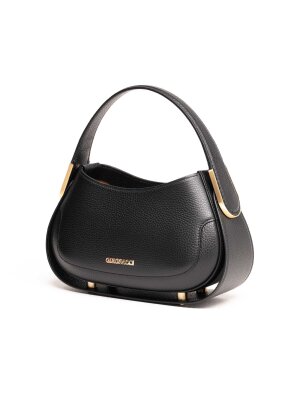 Elegantna crna torba izrađena od kvalitetne kože s profinjenom teksturom. Moderan zaobljeni oblik dodatno naglašavaju metalni zlatni detalji i čvrsta ručka za udobno nošenje. Kompaktna, ali dovoljno prostrana, ova torba savršeno spaja praktičnost i sofisticiran izgled, idealna za poslovne i večernje kombinacije.