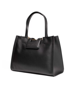 Ova crna torba odiše klasičnom elegancijom i bezvremenskim dizajnom. Izrađena je od kvalitetne glatke kože koja osigurava trajnost i sofisticiran izgled. Pravokutni oblik s čvrstim linijama pruža strukturu i prostranost, dok praktične ručke omogućuju nošenje u ruci ili preko ramena. Diskretni zlatni detalji i utisnuti logo daju dodatnu notu luksuza i prepoznatljivosti.