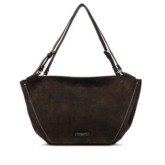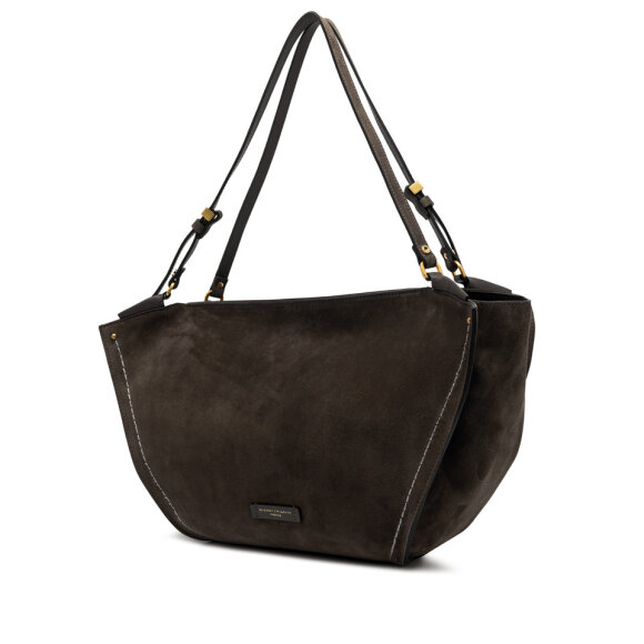 Elegantna Gianni Chiarini torba izrađena je od brušene kože u tamno smeđoj nijansi. Trapez oblik i kontrastni šavovi daju joj moderan izgled, dok podesive ručke omogućuju udobno nošenje u ruci ili na ramenu.