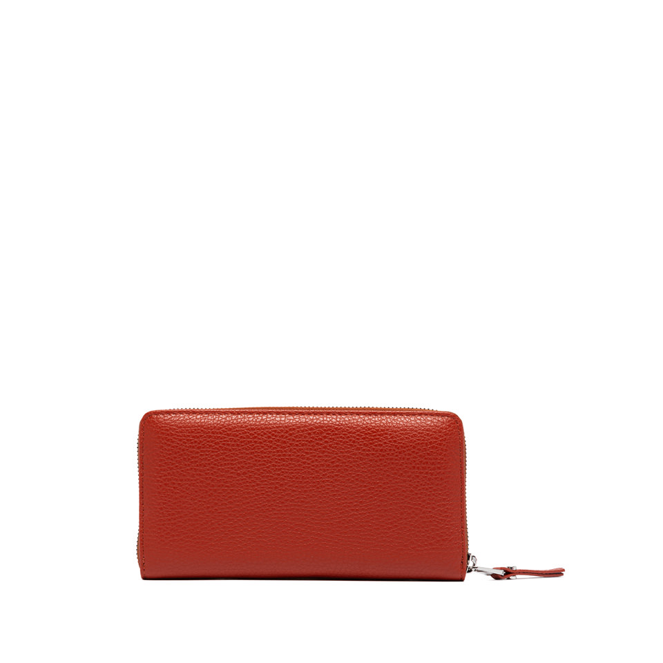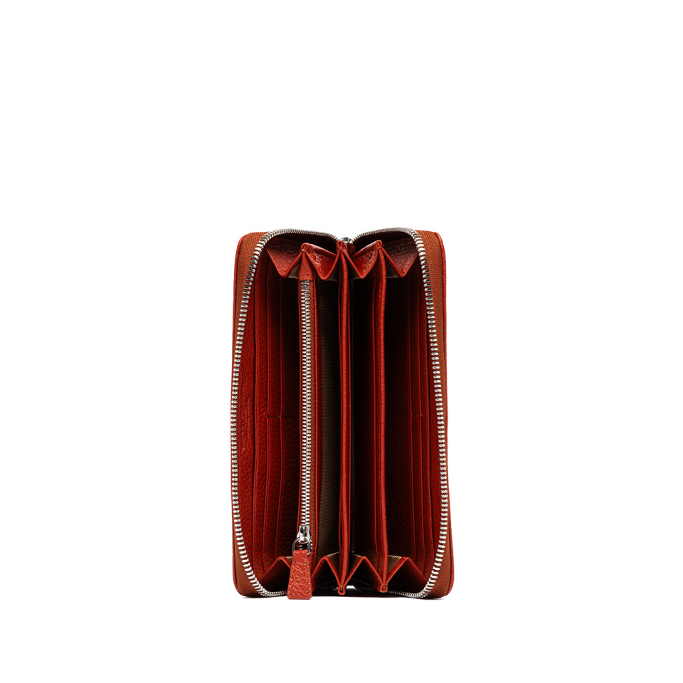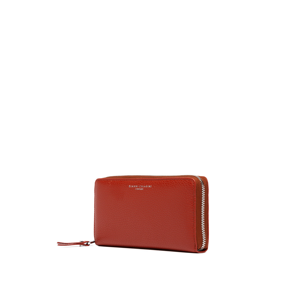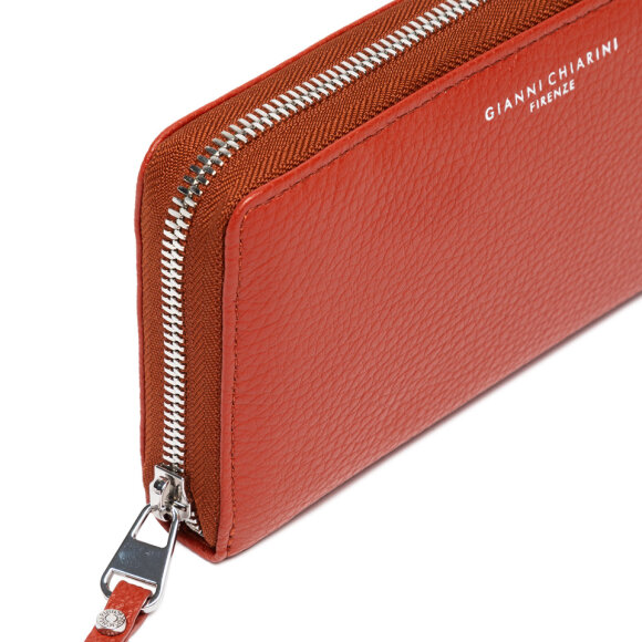 Ovaj elegantni Gianni Chiarini novčanik izrađen je od visokokvalitetne prirodne kože s prepoznatljivom zrnatom teksturom. Model dolazi u toploj ciglano-crvenoj nijansi, idealnoj za moderni, profinjeni izgled. Zahvaljujući cirkularnom patentnom zatvaraču, sadržaj je maksimalno zaštićen, a unutrašnjost je organizirana u više pretinaca za kartice, dokumente, sitniš i novčanice.