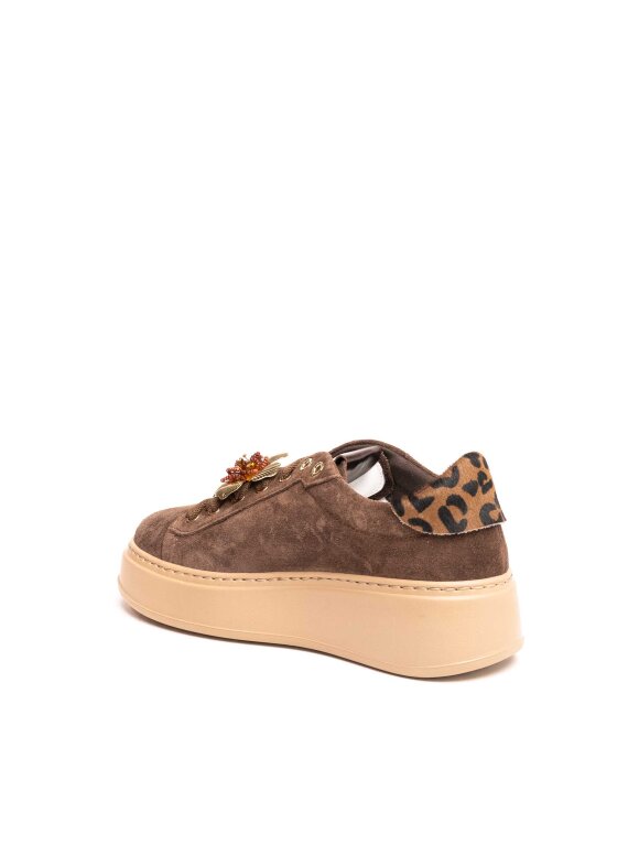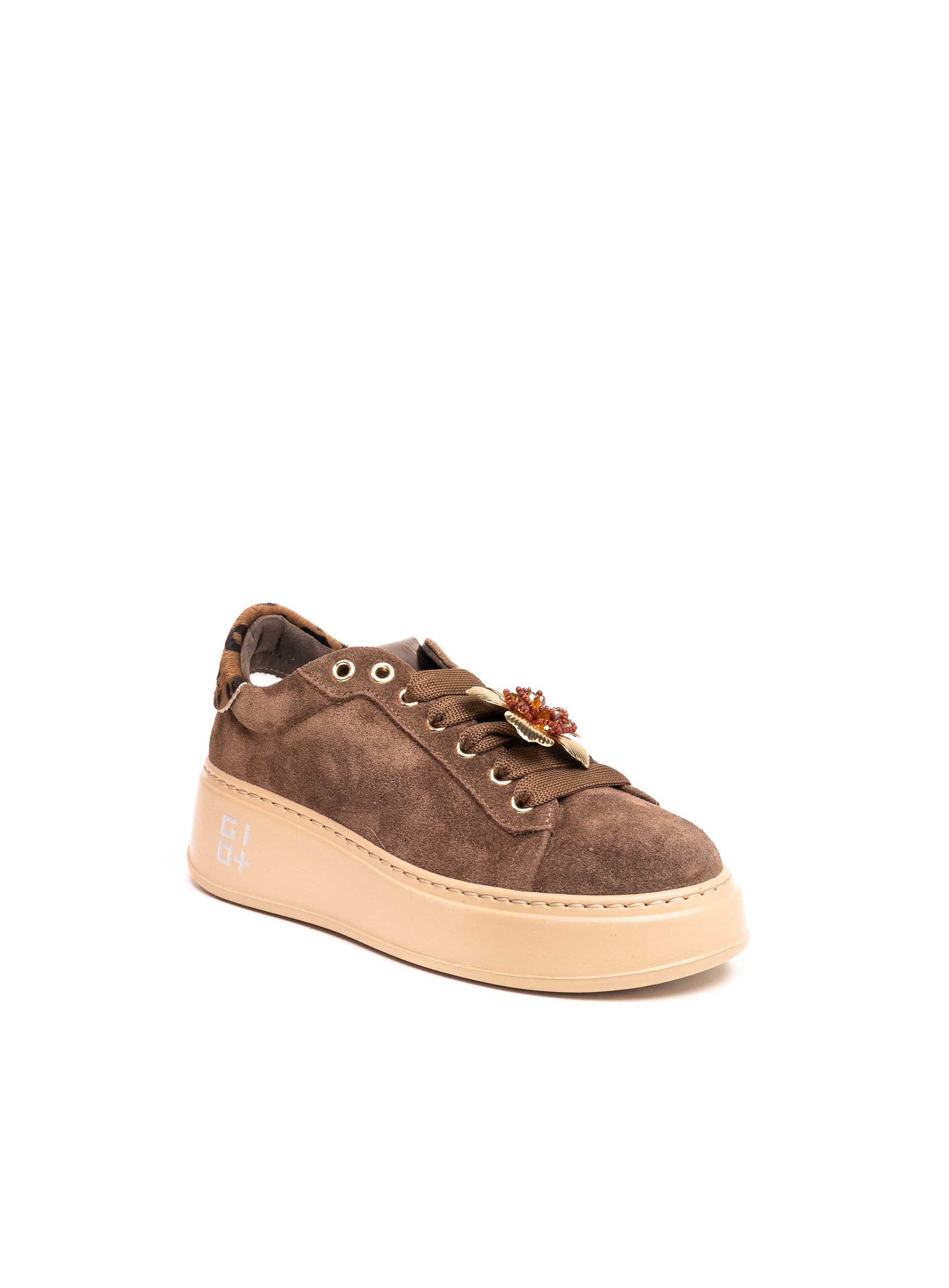 Giove ženske tenisice u smeđoj boji izrađene su od mekane brušene kože, s upečatljivim leo uzorkom na peti koji daje moderan i odvažan izgled. Model dolazi s povišenim potplatom u bež nijansi, koji pruža dodatnu udobnost i trendovski izgled. Dekorativni detalj na vezicama ističe ženstvenost i eleganciju, čineći ih savršenim izborom za svakodnevne kombinacije, od casual outfita do chic urbanih stylinga.