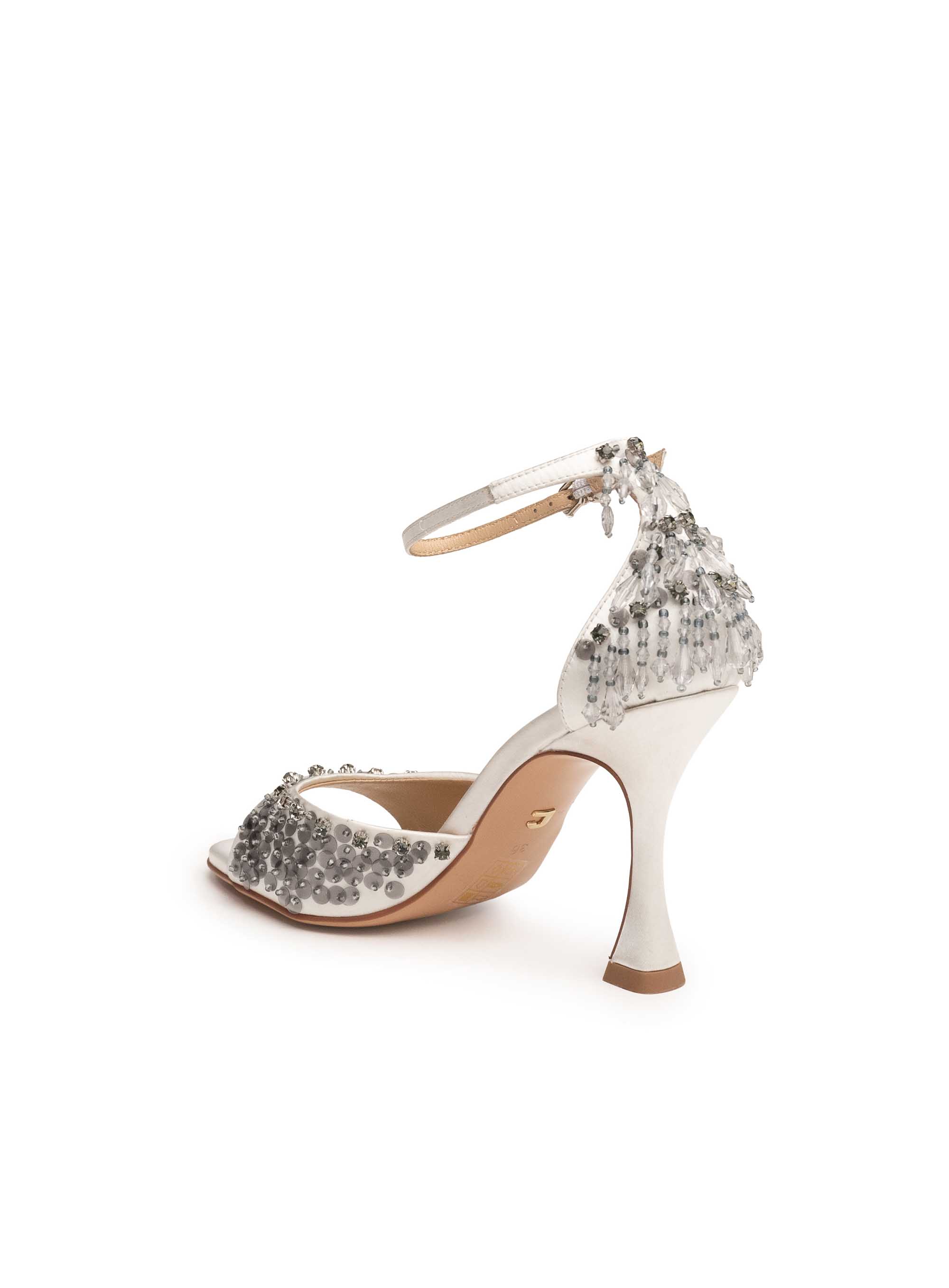 Prednji dio sandale ukrašen je sjajnim kristalima i aplikacijama koje stvaraju luksuzan, svjetlucavi efekt. Leđni dio dodatno je naglašen višeslojnim dekorativnim kamenčićima koji daju dojmu ekstravagancije i visoke mode.