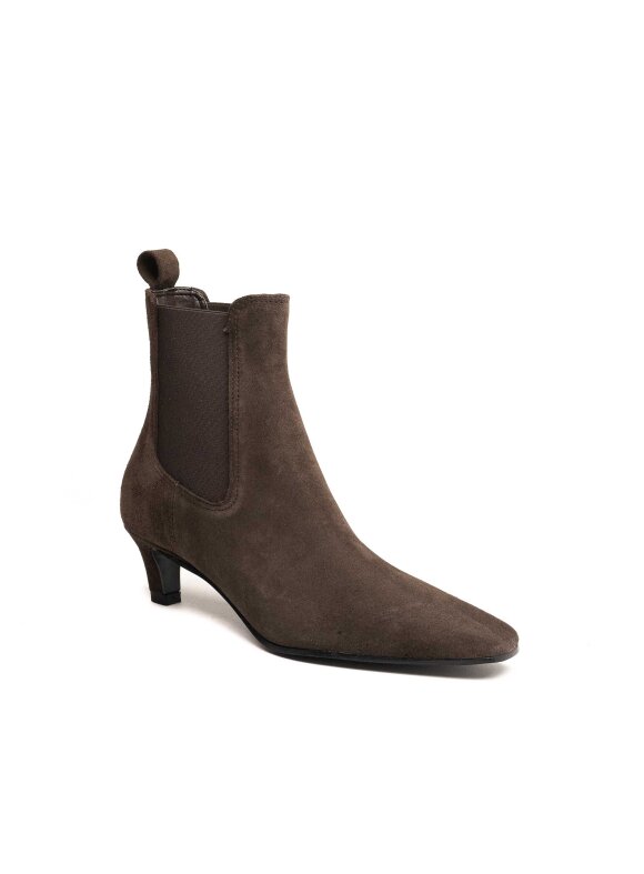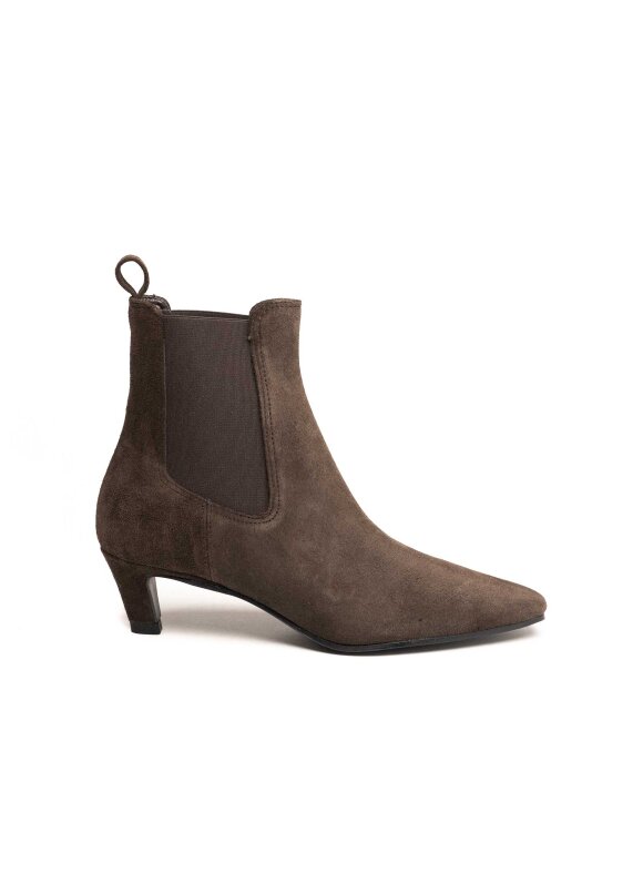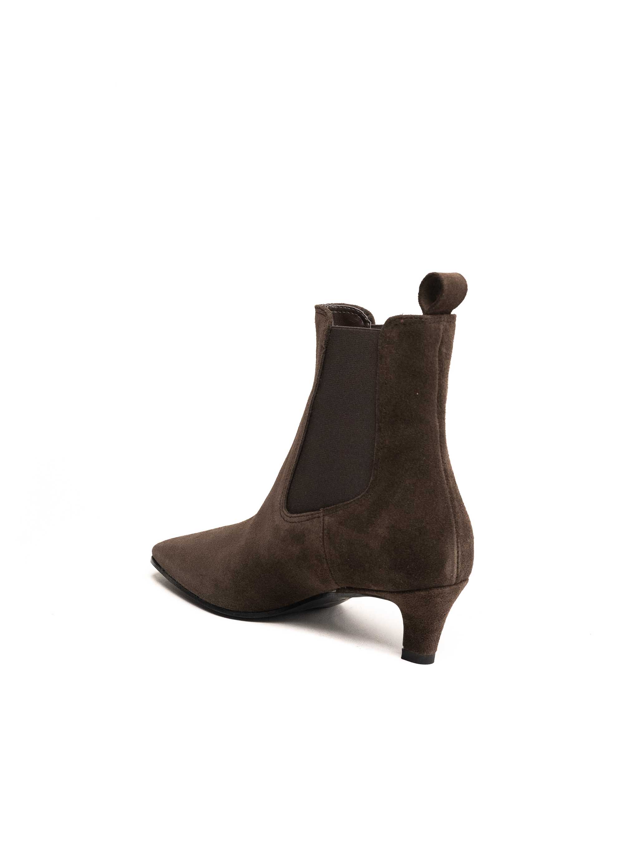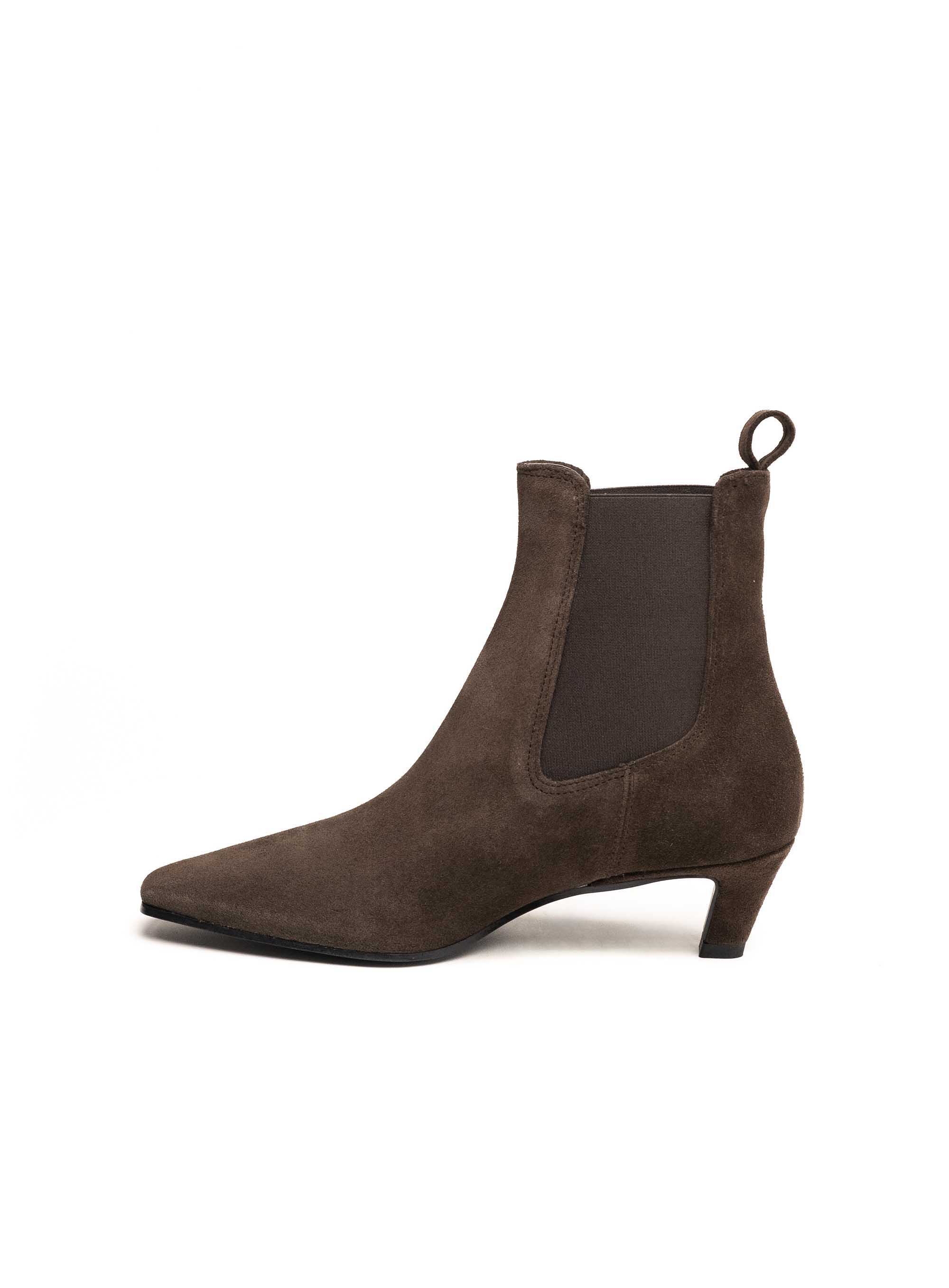 Elegantne ženske gležnjače izrađene su od brušene kože u profinjenoj smeđoj nijansi. Model inspiriran klasičnim Chelsea stilom dolazi s elastičnim bočnim umetcima koji omogućuju lako obuvanje i savršeno prianjanje.