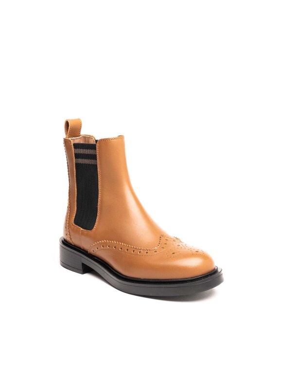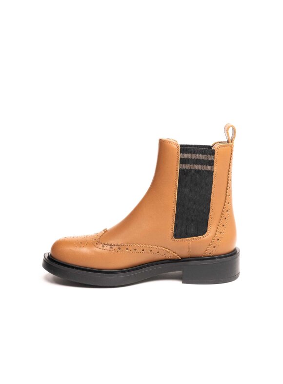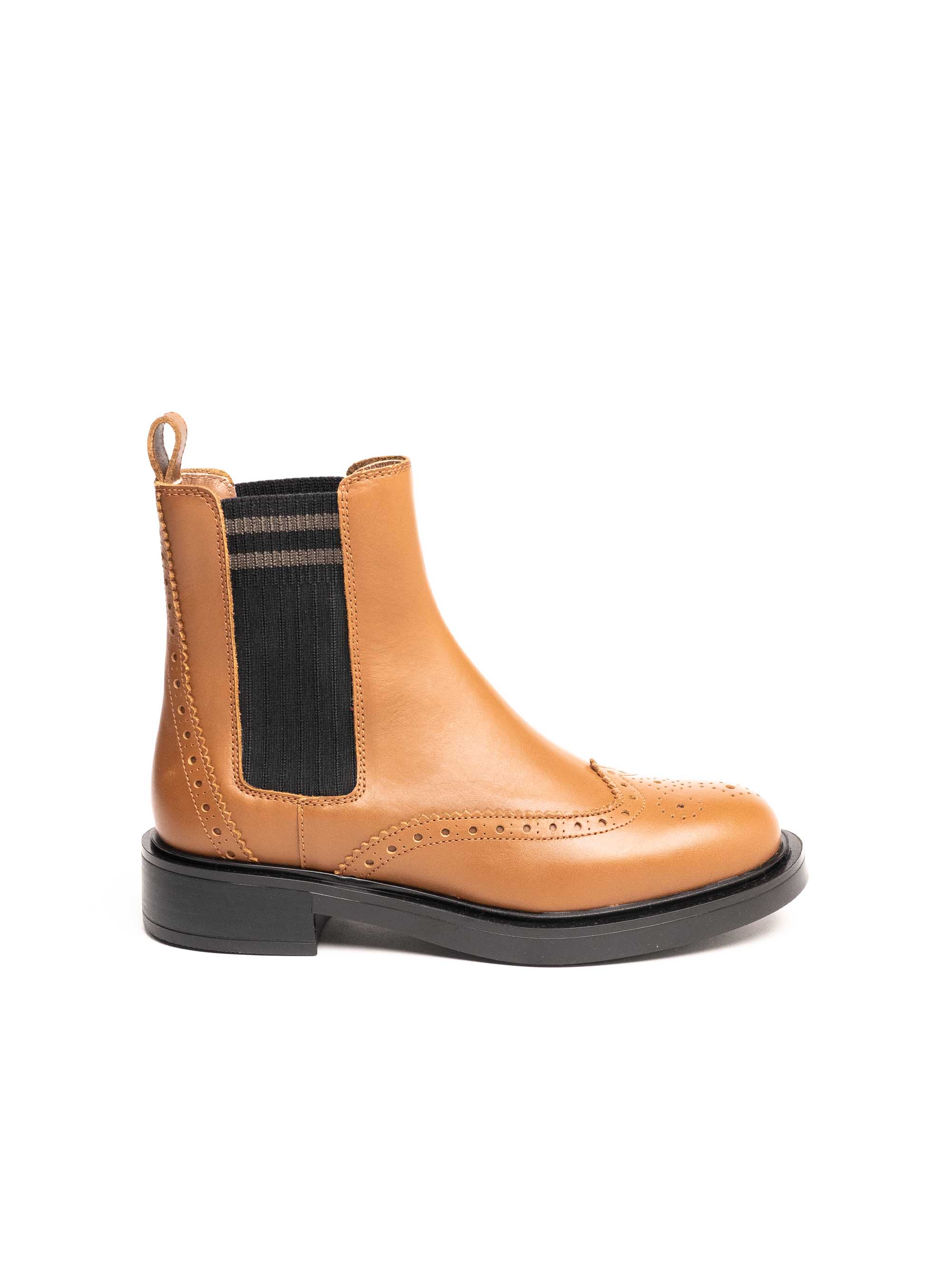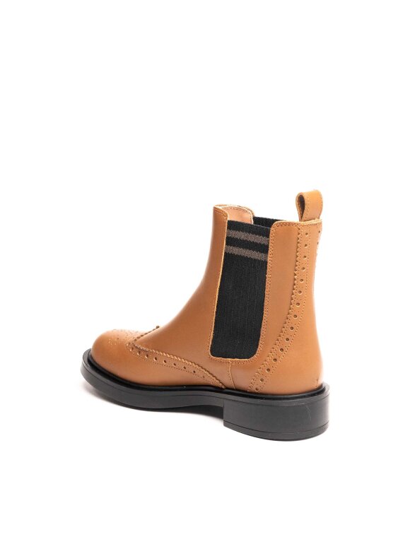 Elegantne gležnjače brenda Pollini, izrađene od visokokvalitetne prirodne kože u svijetlosmeđoj nijansi. Klasičan dizajn nadopunjen je perforiranim brogue detaljima koji im daju sofisticiran izgled. Elastične bočne trake olakšavaju obuvanje, dok gumeni potplat pruža udobnost i stabilnost pri svakom koraku. Savršen odabir za moderne jesensko-zimske kombinacije.