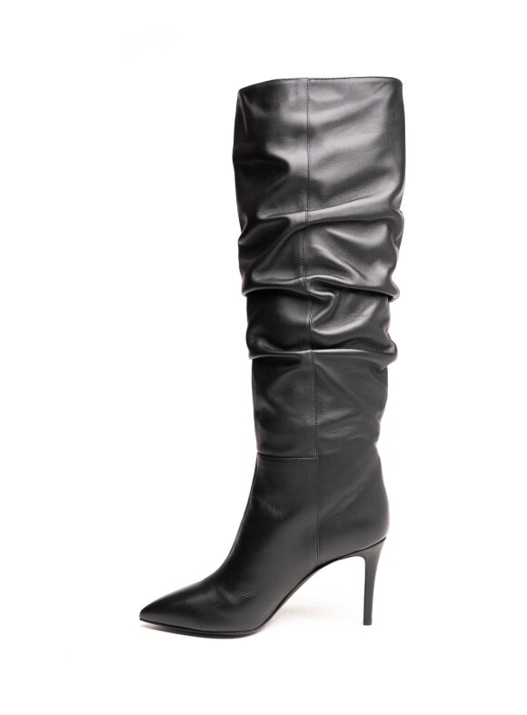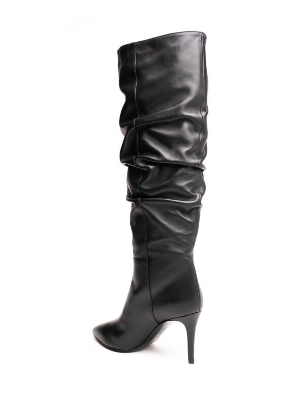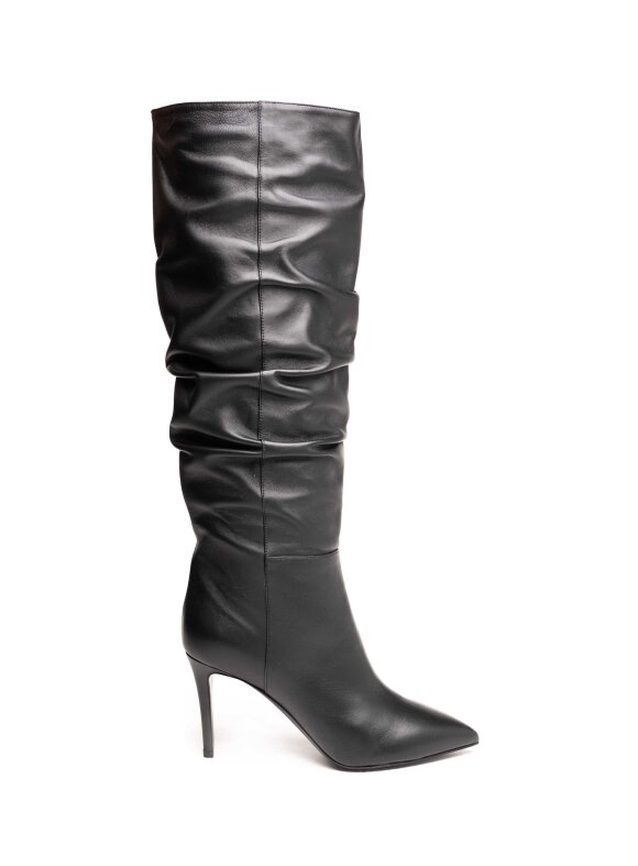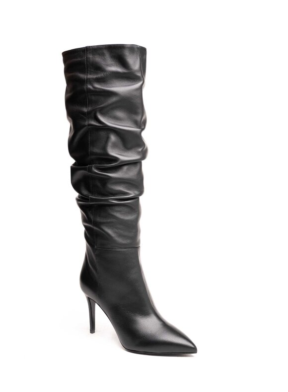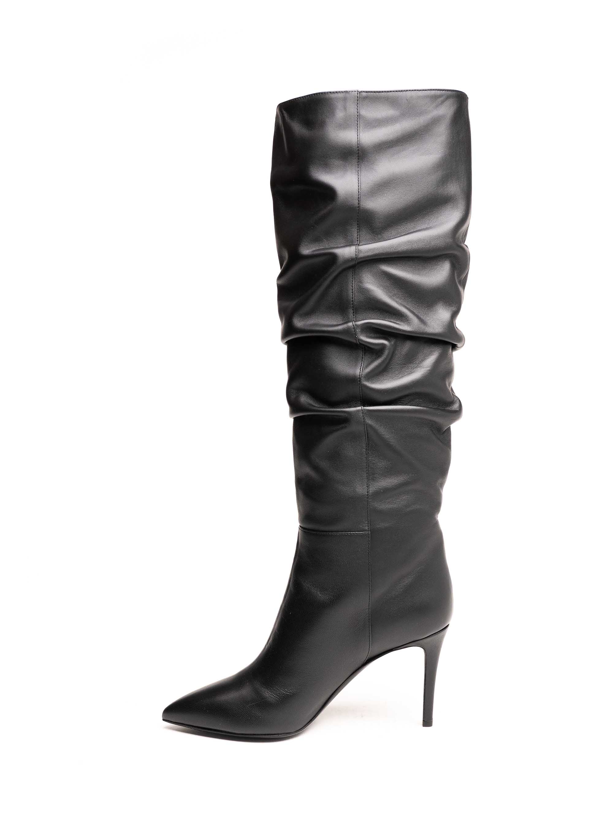 Elegantne visoke čizme brenda Pollini, izrađene od prirodne kože vrhunske kvalitete. Sofisticiran dizajn u crnoj boji s naboranim gornjim dijelom i visokom tankom potpeticom naglašava ženstvenost i eleganciju. Zahvaljujući udobnoj izradi i kvalitetnim materijalima, ove čizme savršen su izbor za poslovne, večernje i svečane kombinacije.
