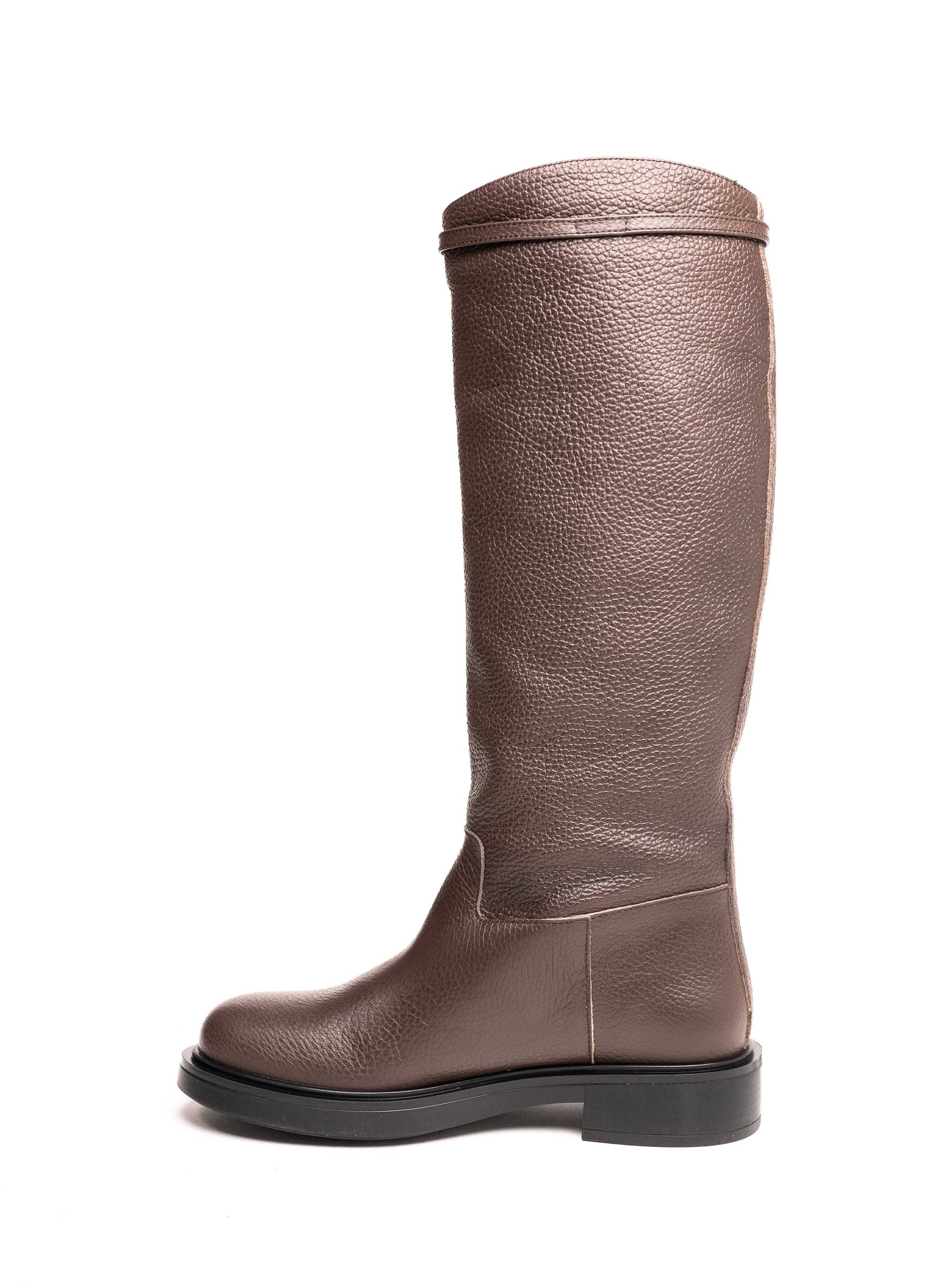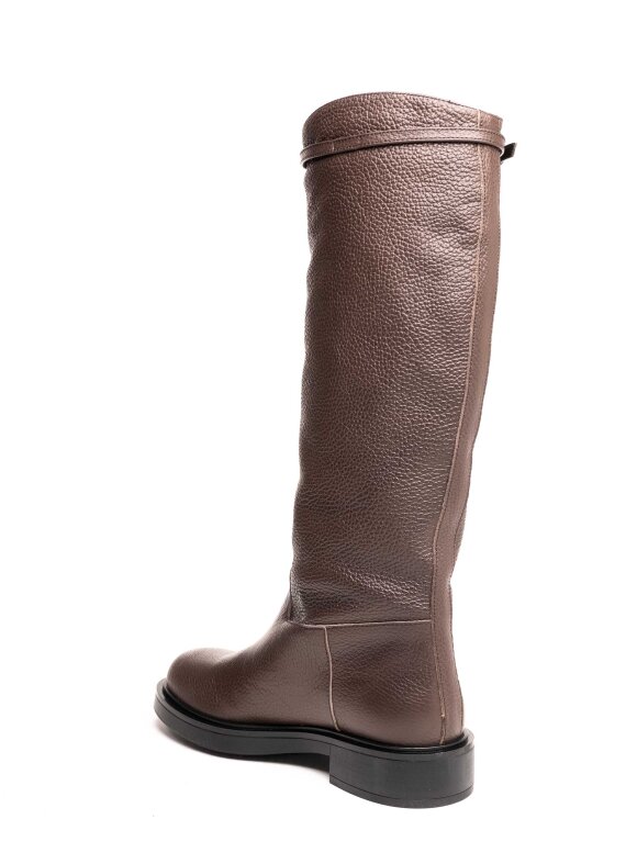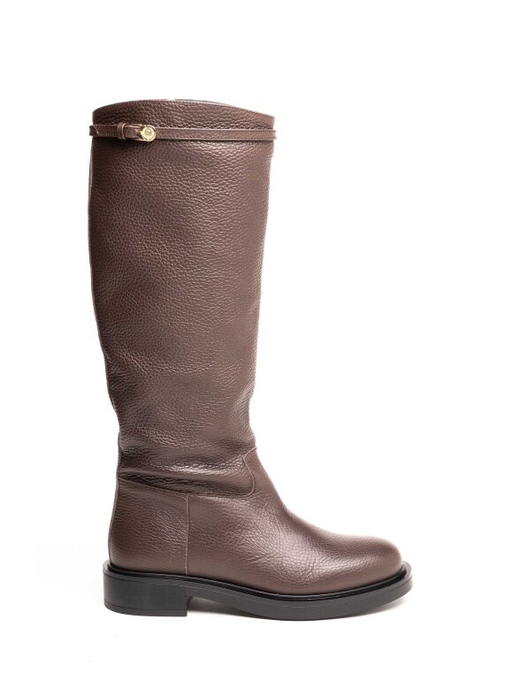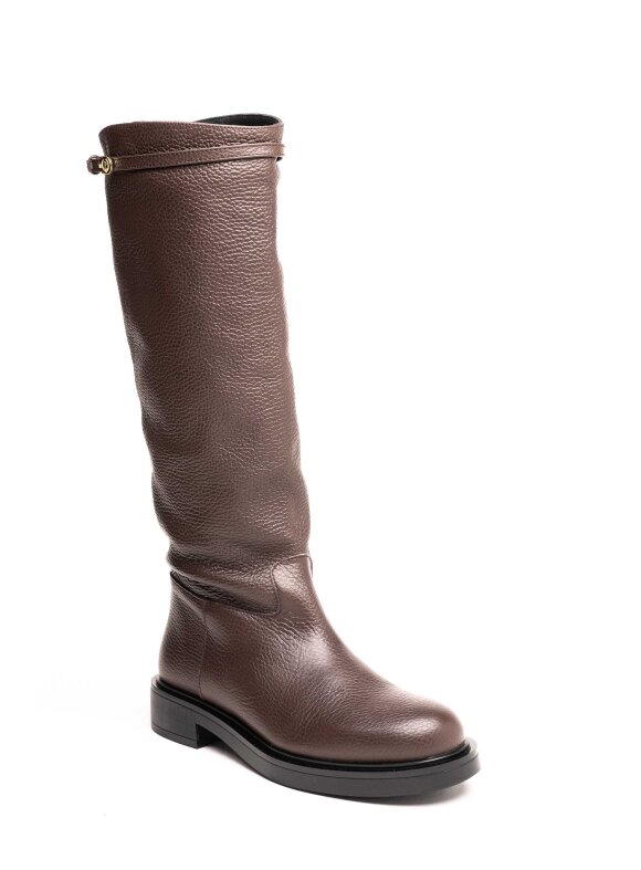 Klasične i elegantne ženske čizme brenda Pollini, izrađene od prirodne smeđe kože s teksturom. Jednostavan, ali profinjen dizajn upotpunjen je tankim ukrasnim remenom s diskretnom metalnom kopčom. Čvrsti gumeni potplat osigurava udobnost i stabilnost pri svakodnevnom nošenju, dok bezvremenski stil omogućuje lako kombiniranje s različitim outfitima.