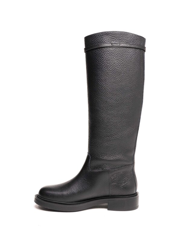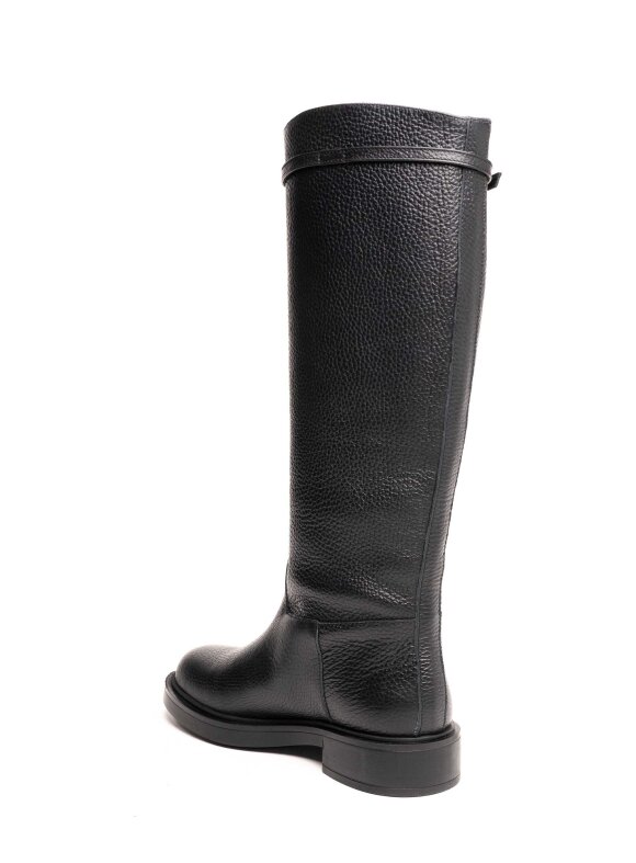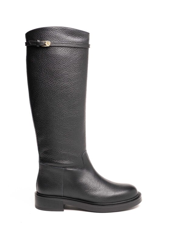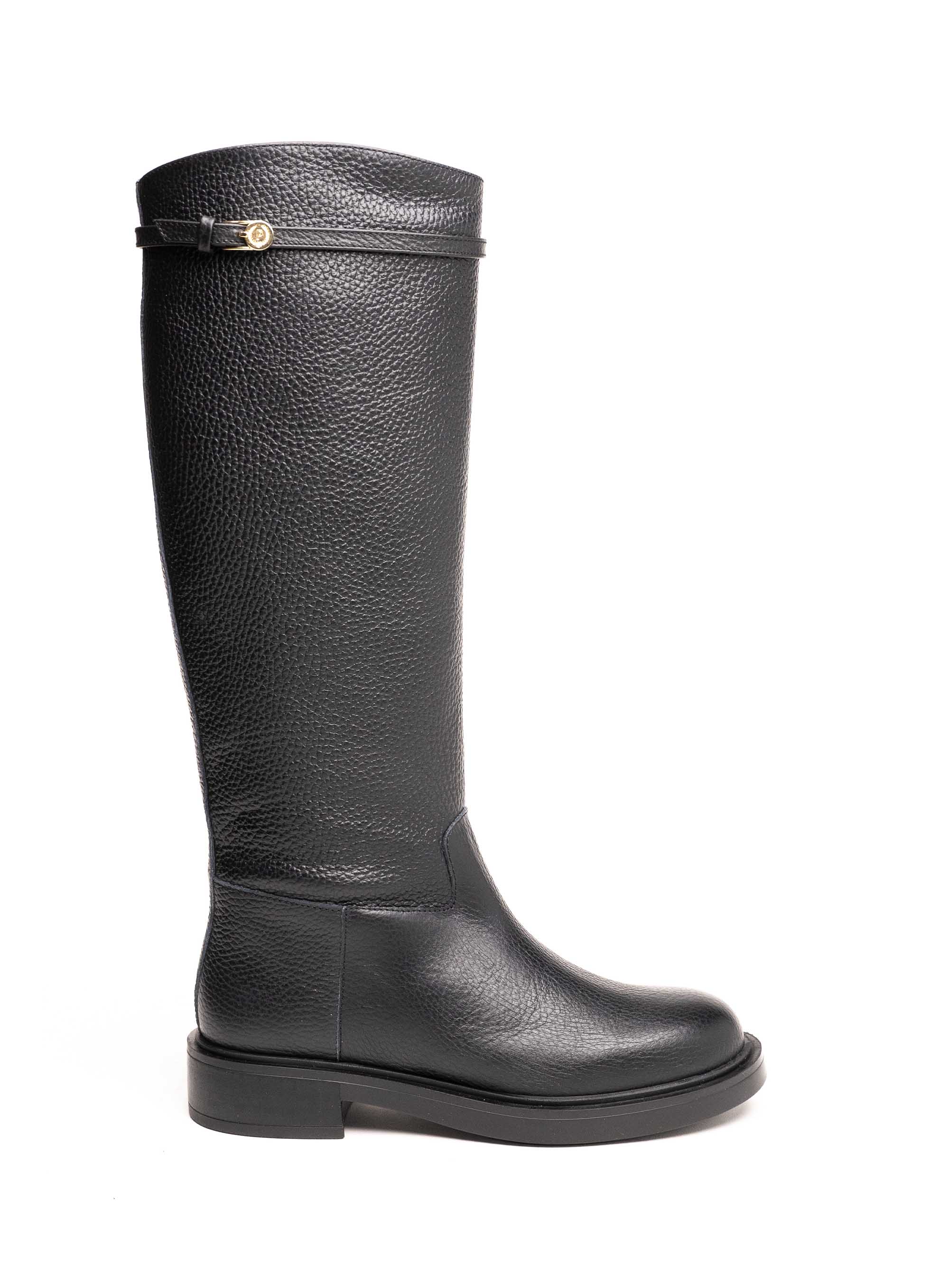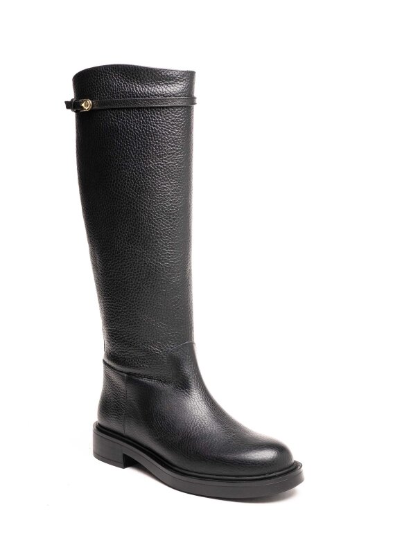Elegantne i bezvremenske visoke čizme brenda Pollini, izrađene od prirodne kože u klasičnoj crnoj boji. Dizajn upotpunjuje tanak ukrasni remen sa zlatnim detaljem, dok čvrsti gumeni potplat pruža udobnost i stabilnost pri svakodnevnom nošenju. Ove čizme savršen su izbor za poslovne, casual i elegantne kombinacije tijekom hladnijih dana.