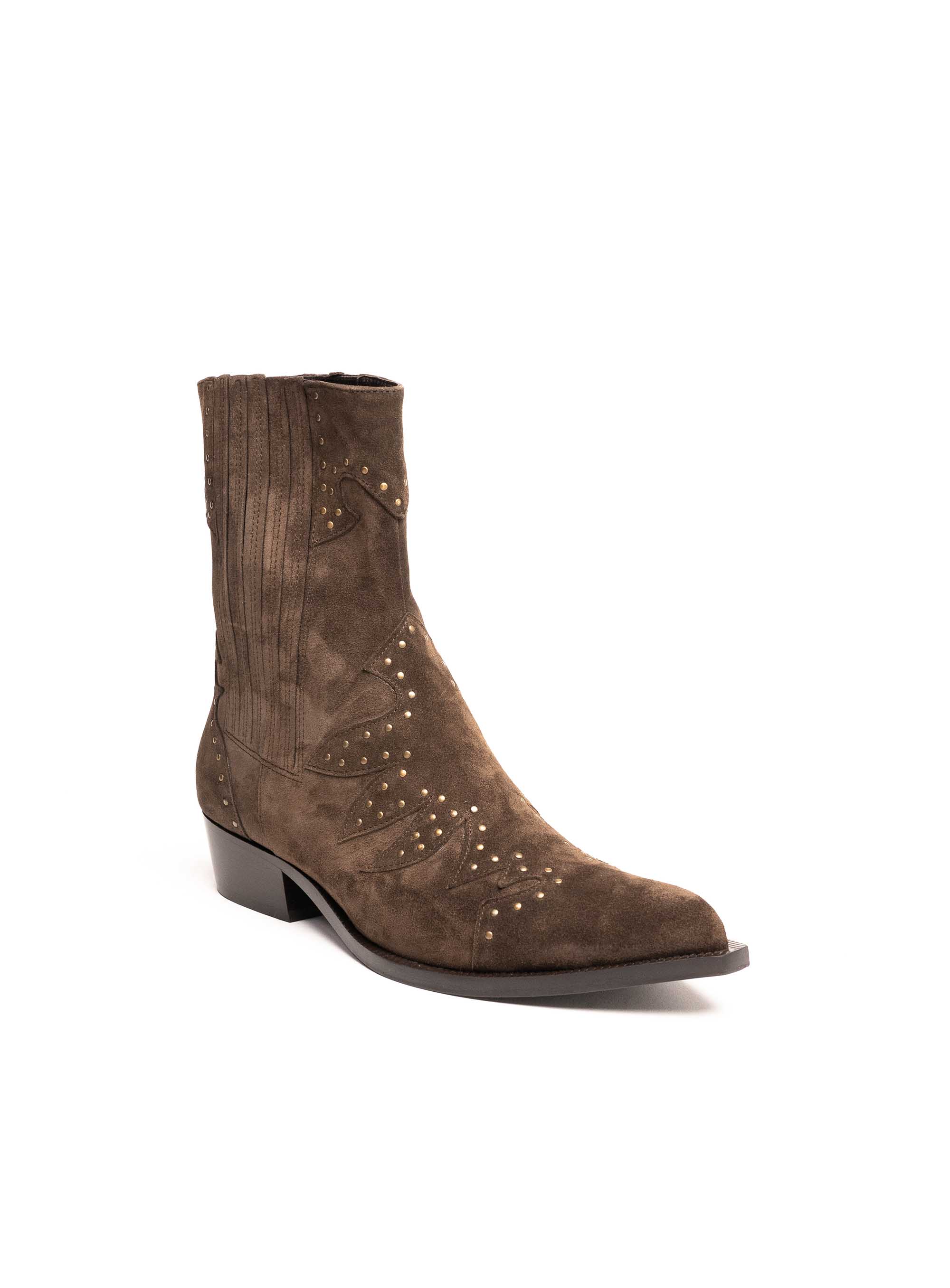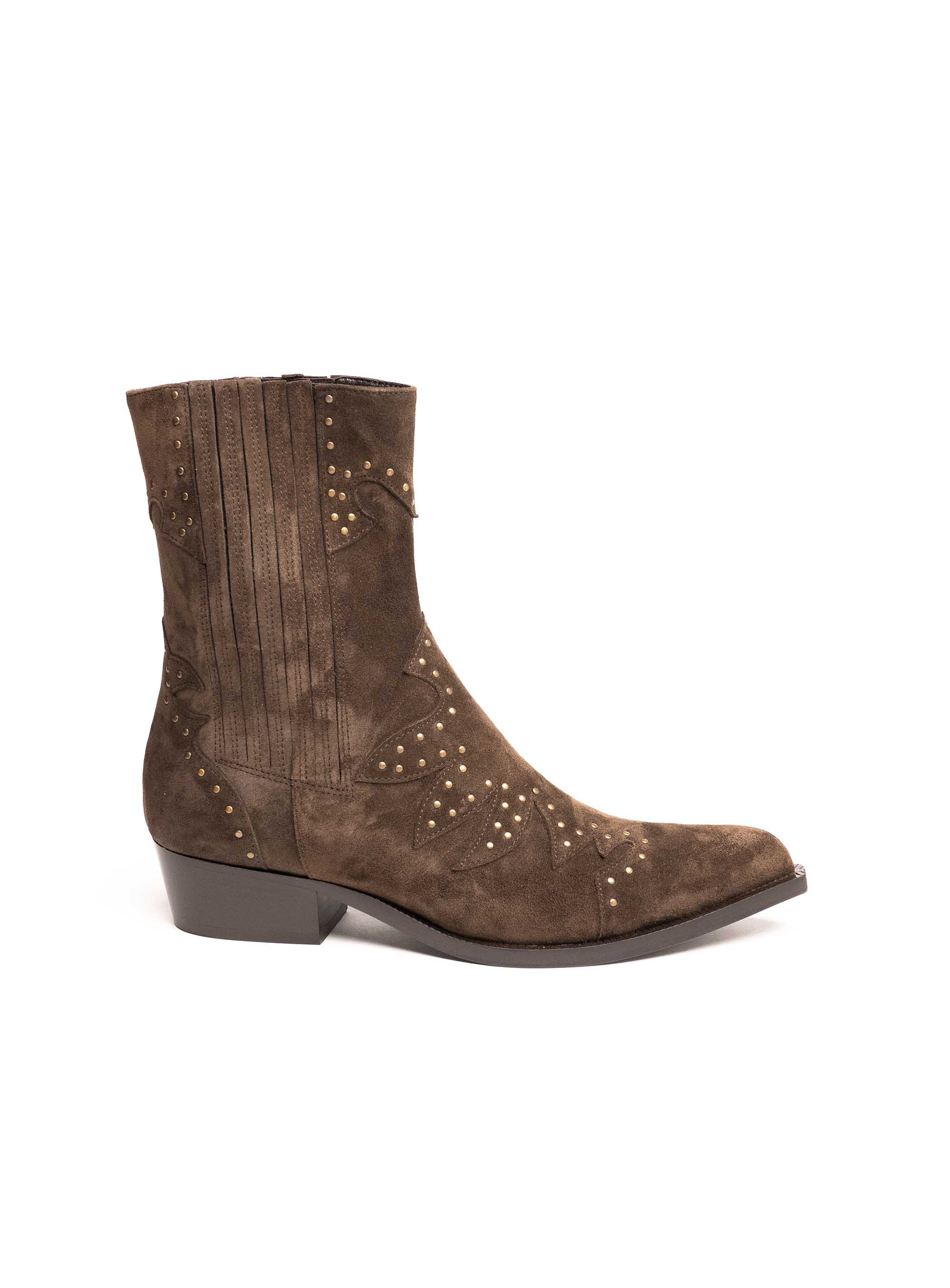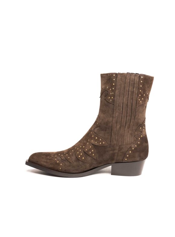 Ove elegantne Guglielmo Rotta gležnjače izrađene su od brušene prirodne kože u sofisticiranoj smeđoj nijansi. Model inspiriran kaubojskim stilom donosi dašak šarma, a ukrasne zlatne zakovice i profinjeni šavovi daju im prepoznatljiv karakter.