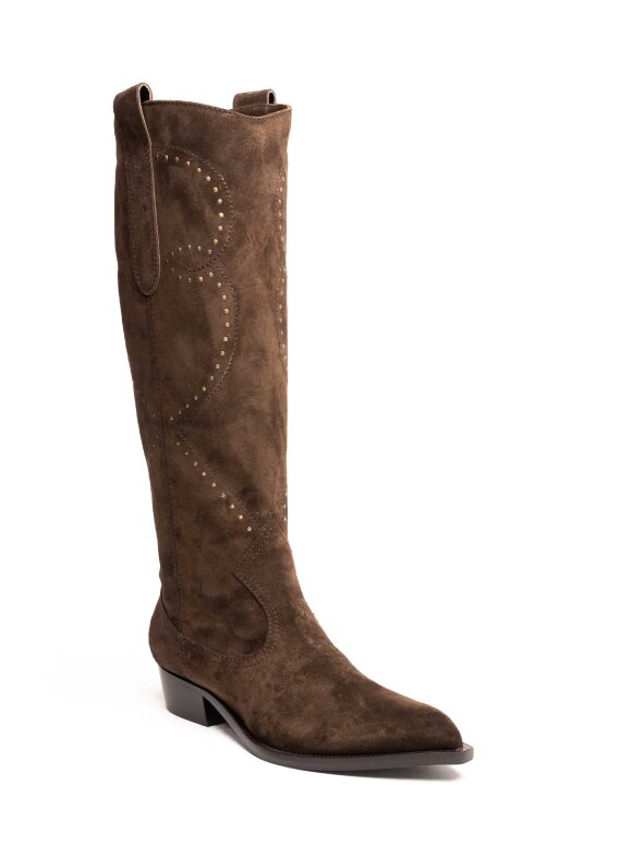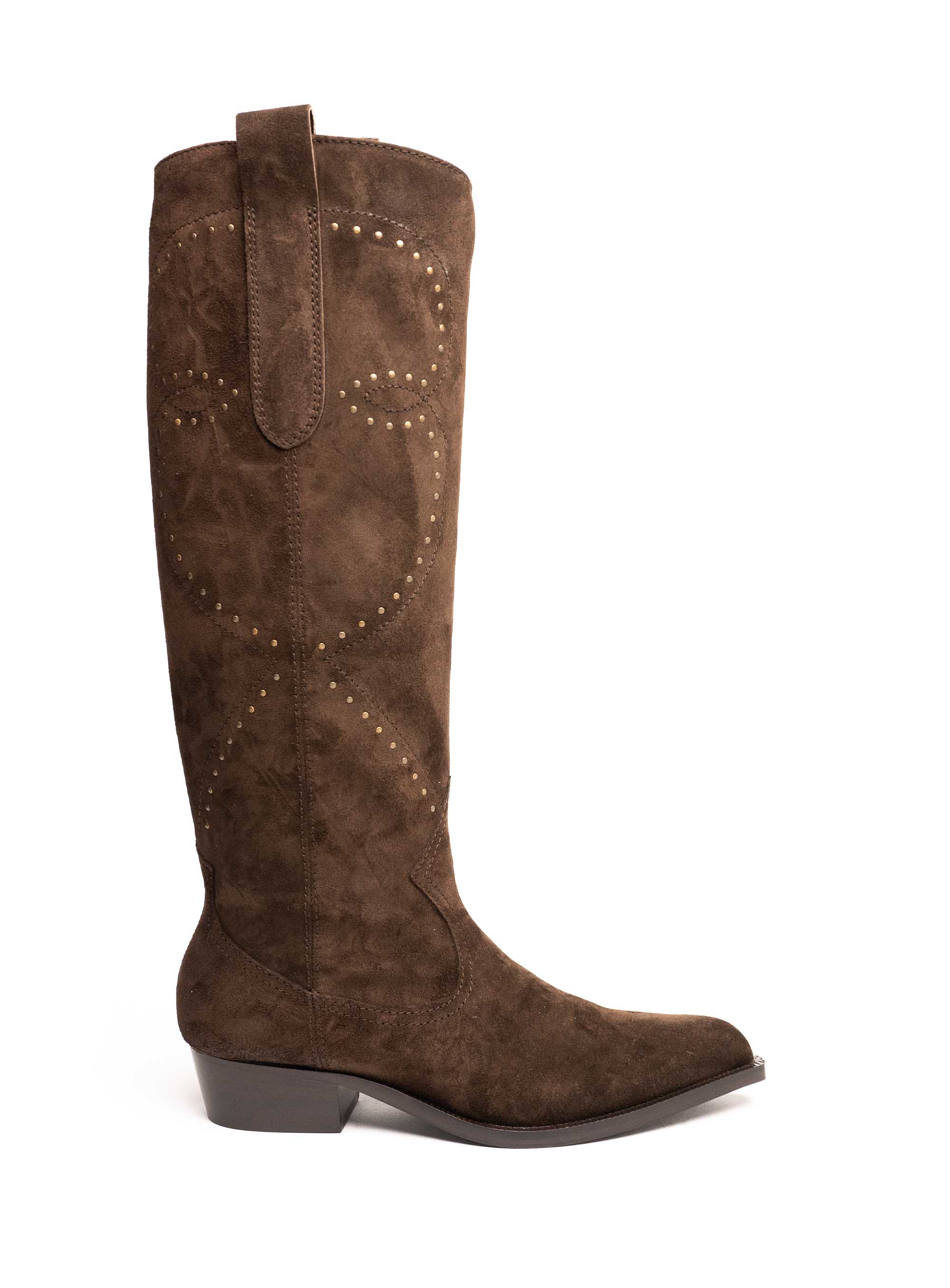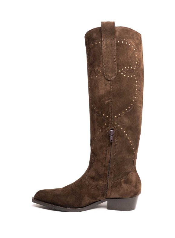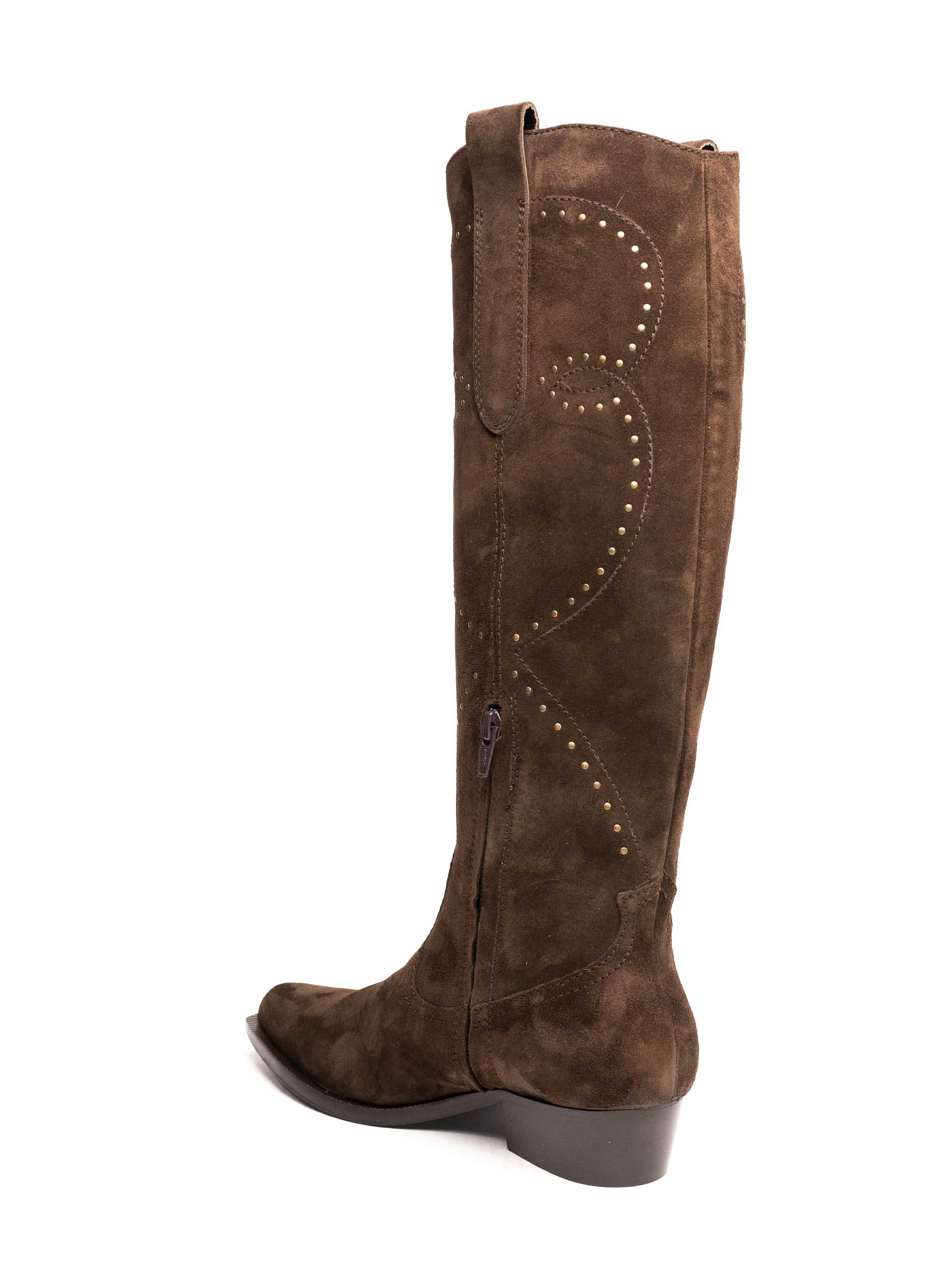 Elegantne i profinjene, ove Guglielmo Rotta čizme izrađene su od velur prirodne kože u toploj smeđoj nijansi. Inspirirane zapadnjačkim (kaubojskim) stilom, krasi ih prepoznatljiv dizajn s dekorativnim zlatnim zakovicama i urezanim šavovima koji ističu ženstvenu siluetu.