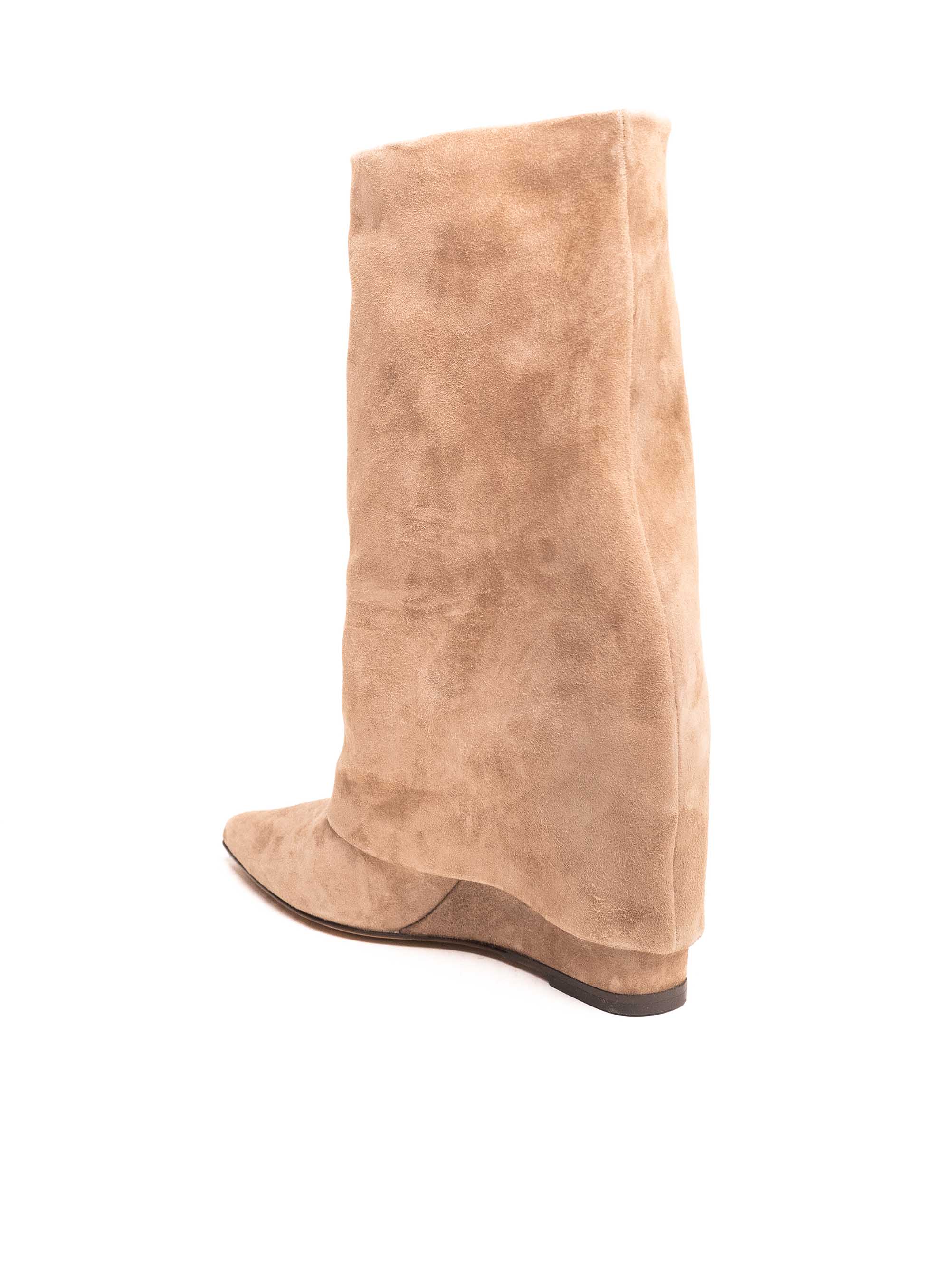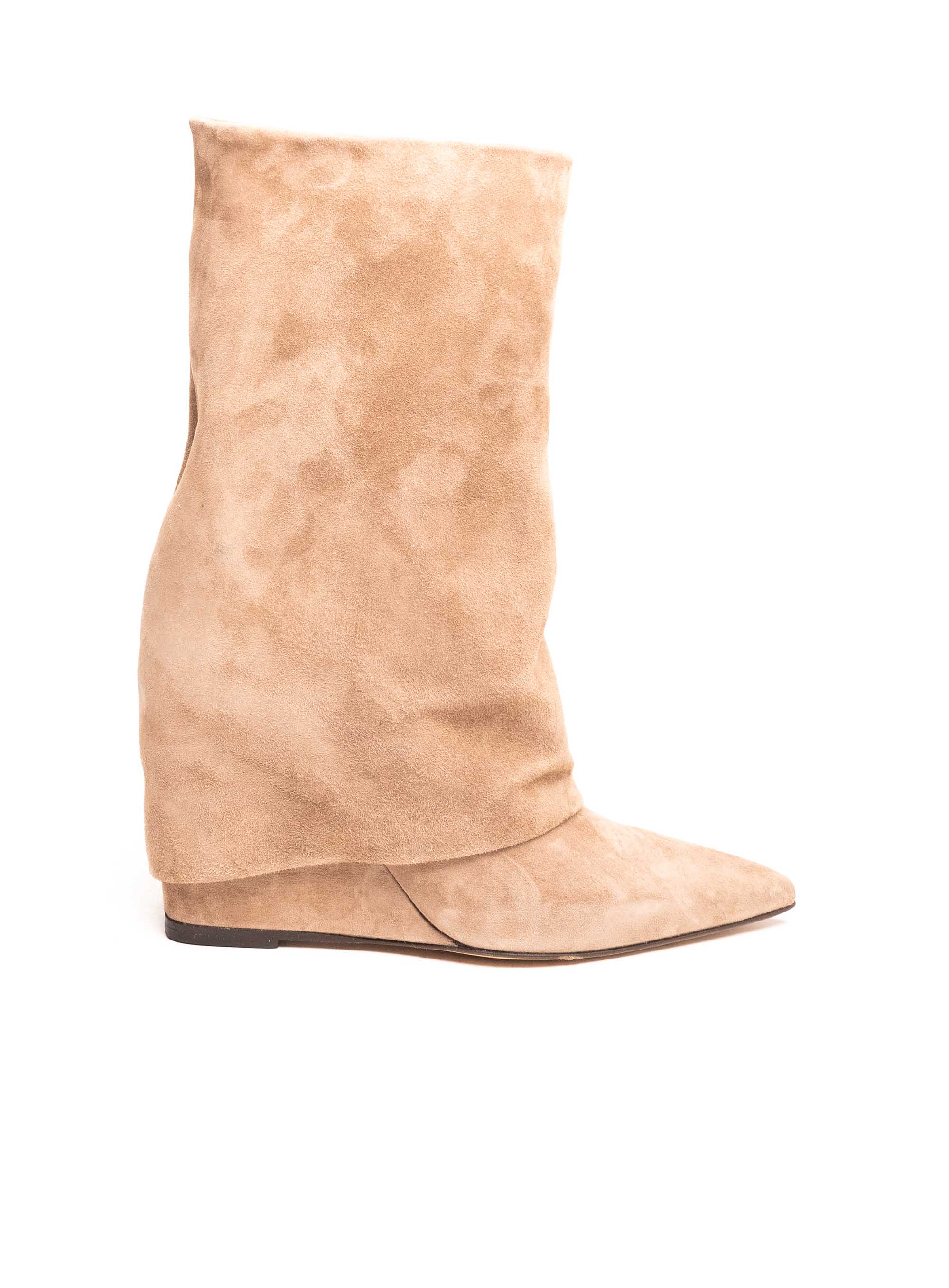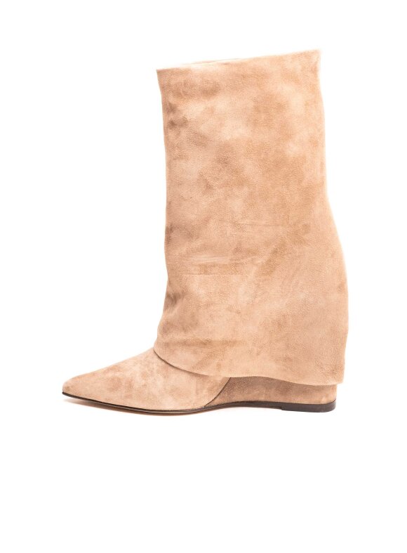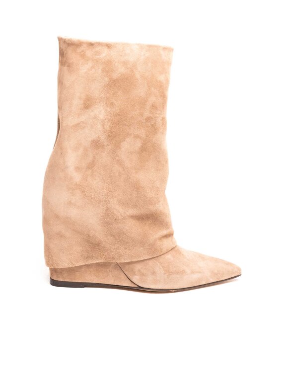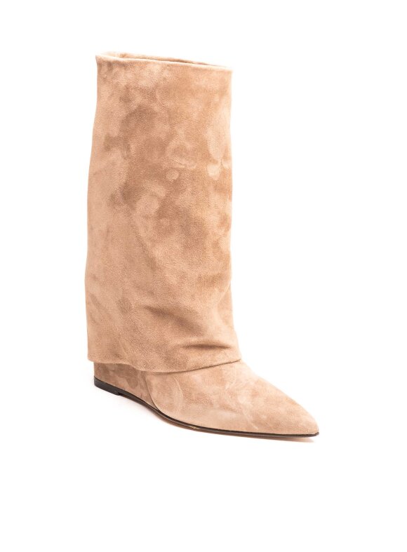 Anima čizme u bež nijansi izrađene su od meke brušene kože koja pruža sofisticiran i prirodan izgled. Karakterizira ih opuštena silueta s lagano spuštenim gornjištem i špicastim vrhom, što ih čini modernim i elegantnim izborom. Skrivena wedge potpetica osigurava udobnost i vizualno izdužuje figuru, dok minimalistički dizajn olakšava kombiniranje s različitim outfitima – od dnevnih do večernjih.