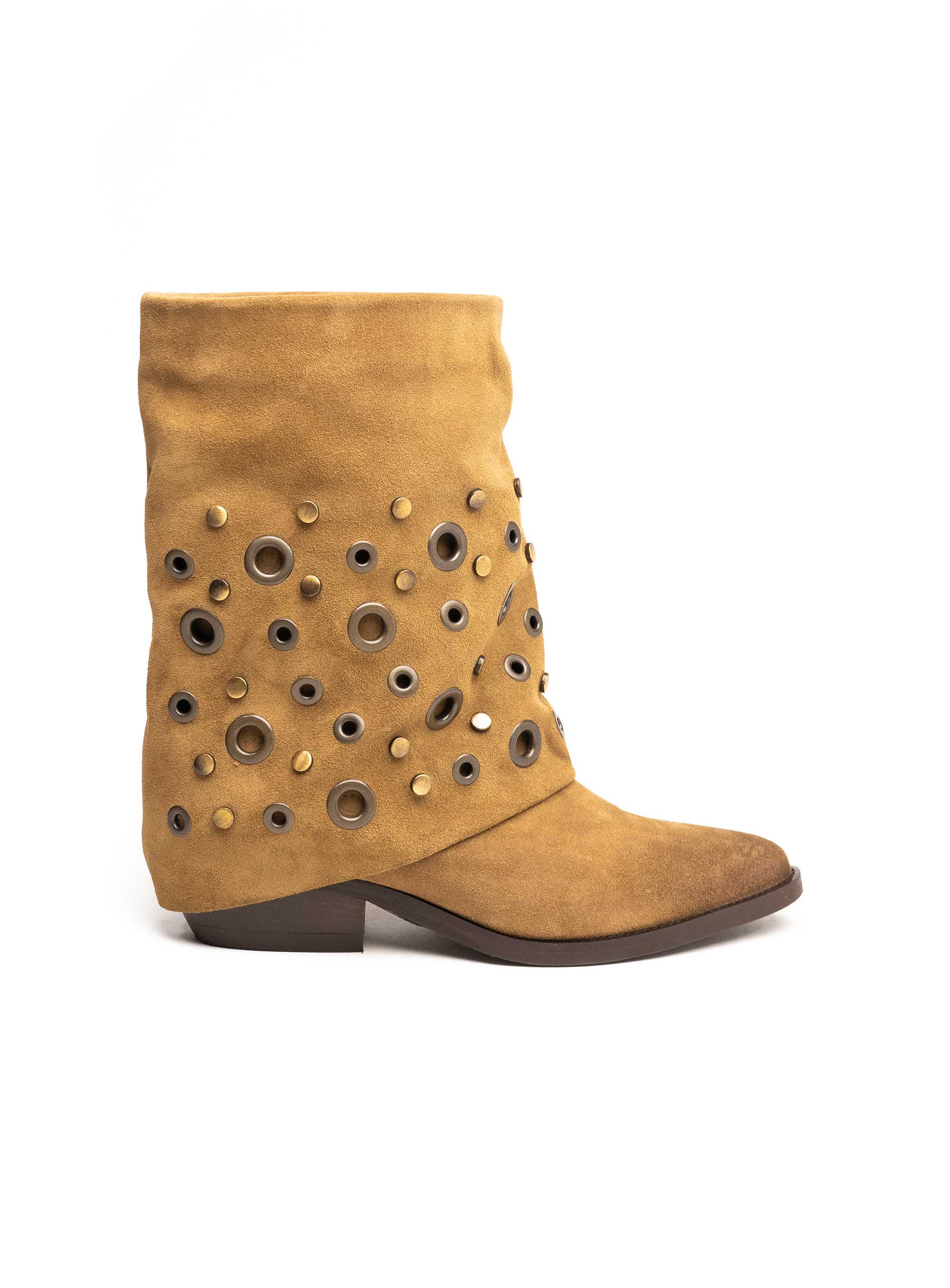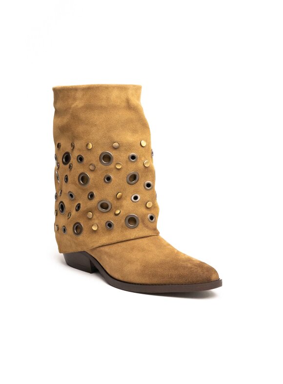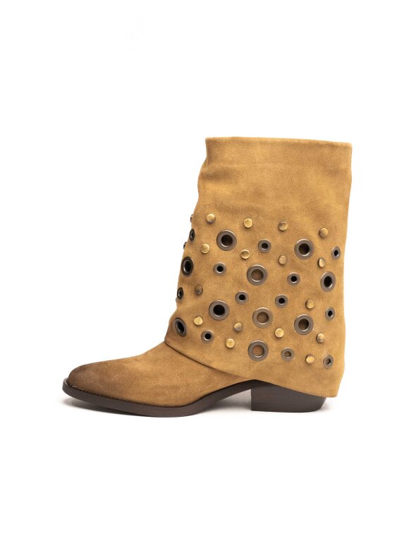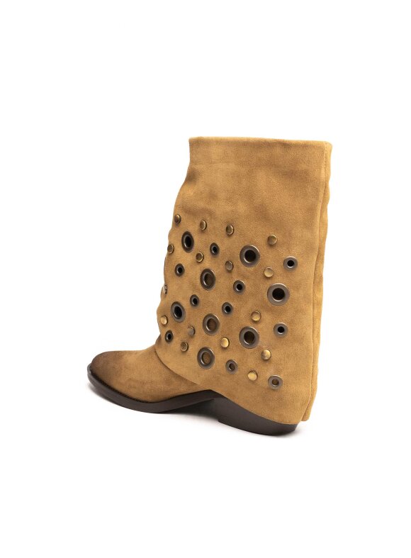 Moderne ženske gležnjače izrađene od brušene kože s bogatim ukrasnim metalnim detaljima koji im daju prepoznatljiv karakter. Mekani gornji dio i blago spuštena silueta stvaraju opušten, ali izrazito stylish izgled. Niski potplat osigurava udobnost, dok kombinacija teksture kože i metalnih aplikacija čini ovaj model savršenim izborom za žene koje vole izražajan, suvremen stil. Idealne su za dnevne modne kombinacije i ležerne outfite s dozom luksuza.