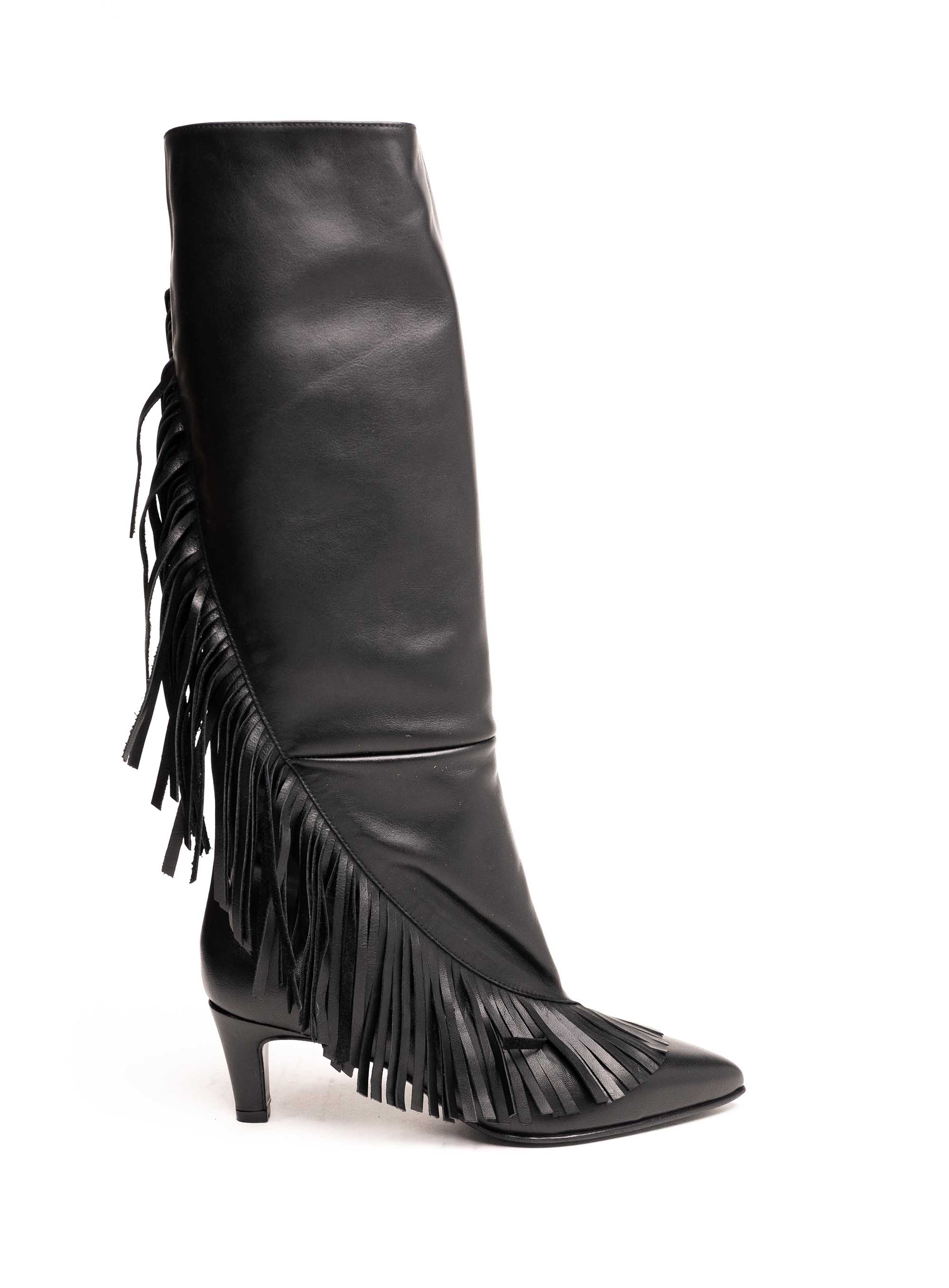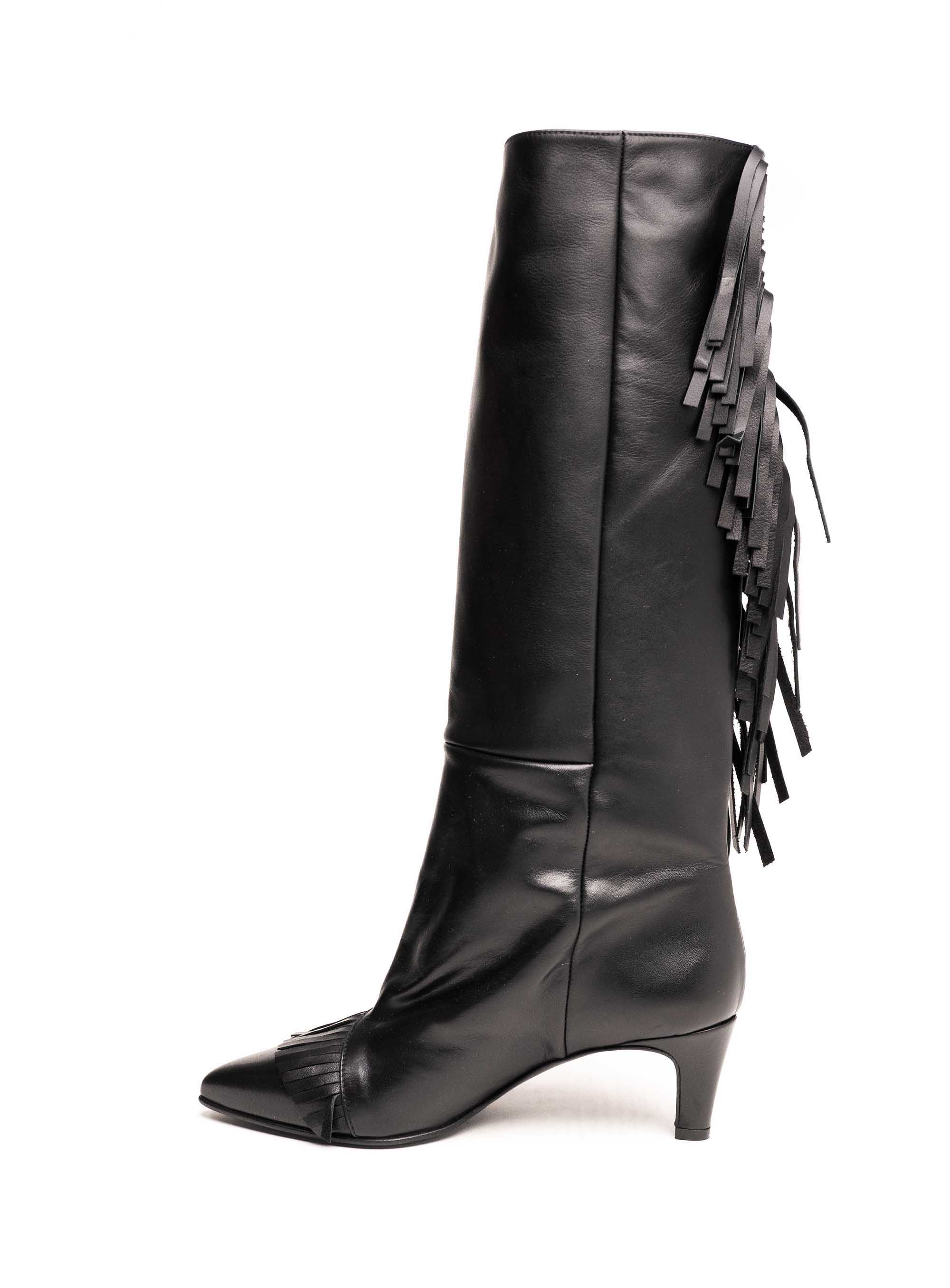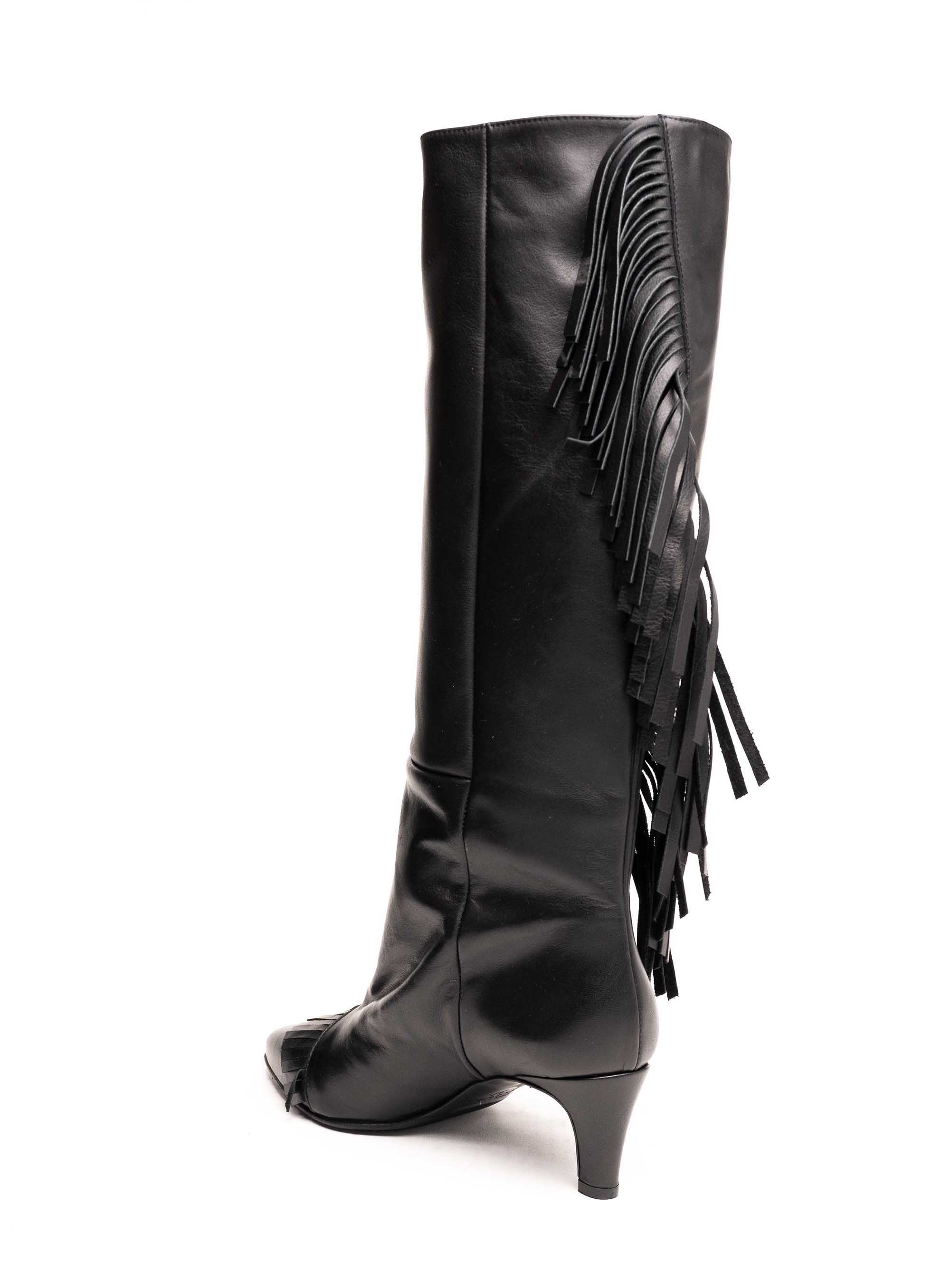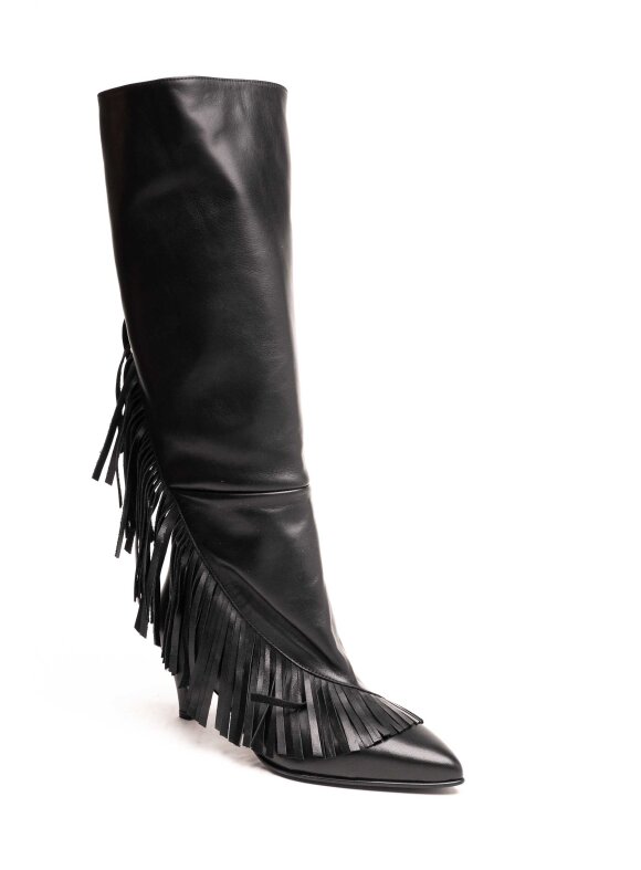 Strategia crne visoke čizme izrađene od luksuzne prirodne kože donose snažan modni statement zahvaljujući efektu resa koje prate liniju čizme od vrha do pete. Ovaj model do koljena kombinira eleganciju i boho glam stil, dok špicasti vrh i srednje visoka potpetica naglašavaju ženstvenost i vizualno izdužuju nogu.Rese unose dinamiku i pokret u svaku kombinaciju, čineći ih idealnim izborom za žene koje žele obuću koja se ističe. Bezvremenska crna boja i vrhunska kvaliteta kože omogućuju jednostavno kombiniranje – od dnevnih casual outfita s trapericama i kožnom jaknom do večernjih kombinacija uz haljinu ili kaput.Kao dio ekskluzivne Strategia kolekcije, ove čizme spajaju talijansku tradiciju izrade, luksuzne materijale i moderan dizajn. Predstavljaju investiciju u obuću koja donosi udobnost, dugotrajnost i poseban modni karakter.