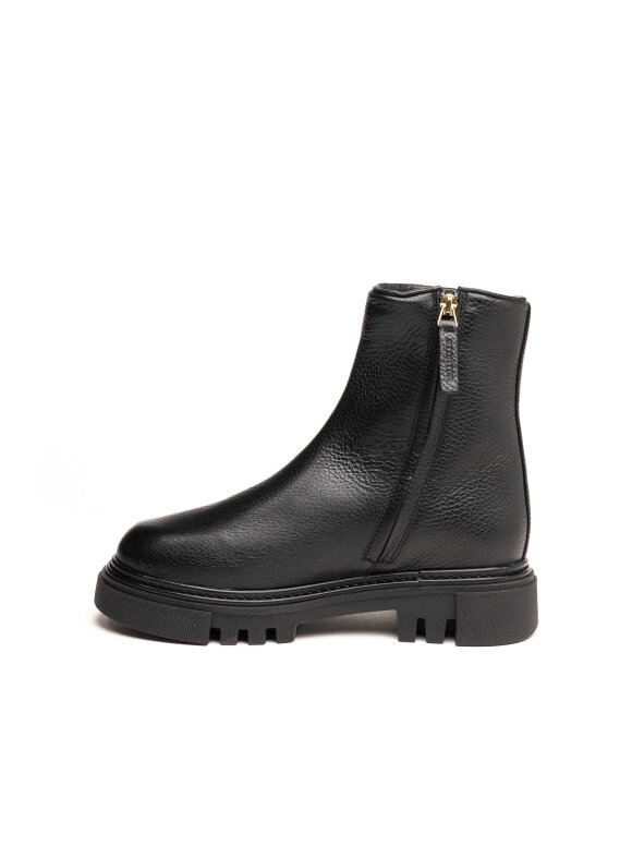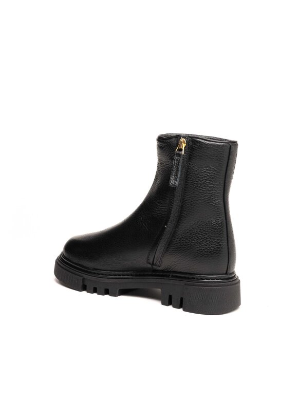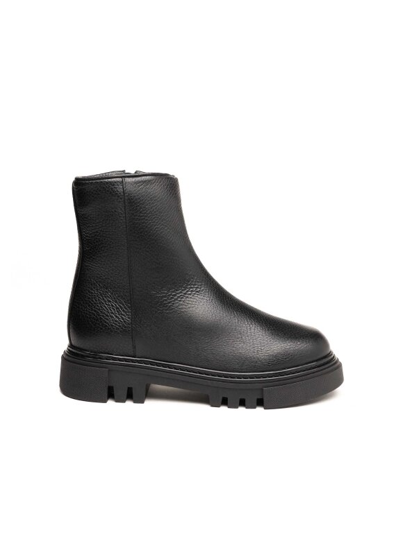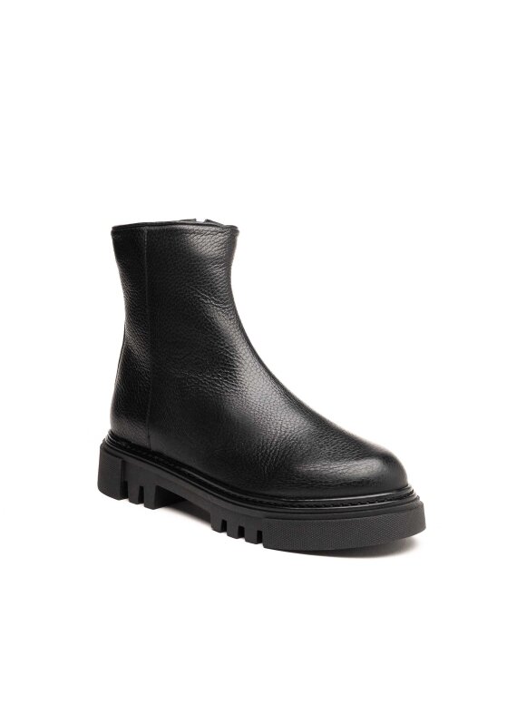 Elegantne i praktične Stokton gležnjače izrađene su od meke zrnate prirodne kože u klasičnoj crnoj boji. Minimalistički dizajn u kombinaciji s debljim rebrastim potplatom pruža savršenu ravnotežu između suvremenog izgleda i funkcionalnosti. Zahvaljujući bočnom patentnom zatvaraču, gležnjače se lako obuvaju i idealne su za svakodnevno nošenje u gradskim uvjetima.