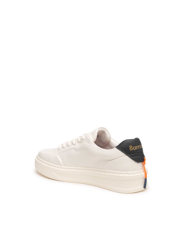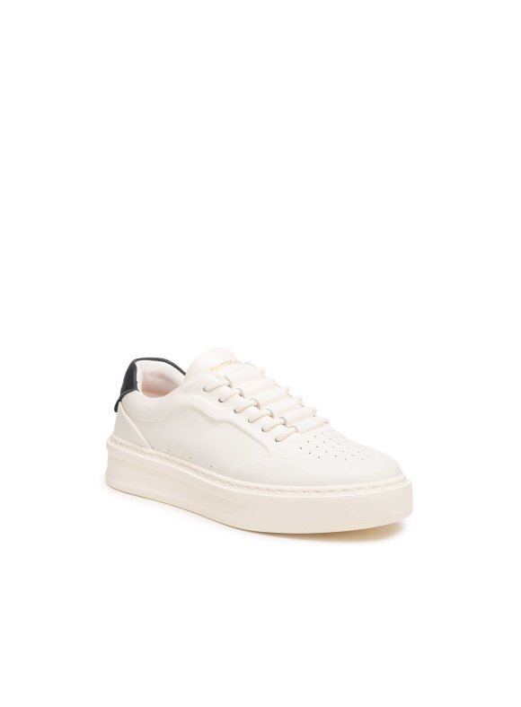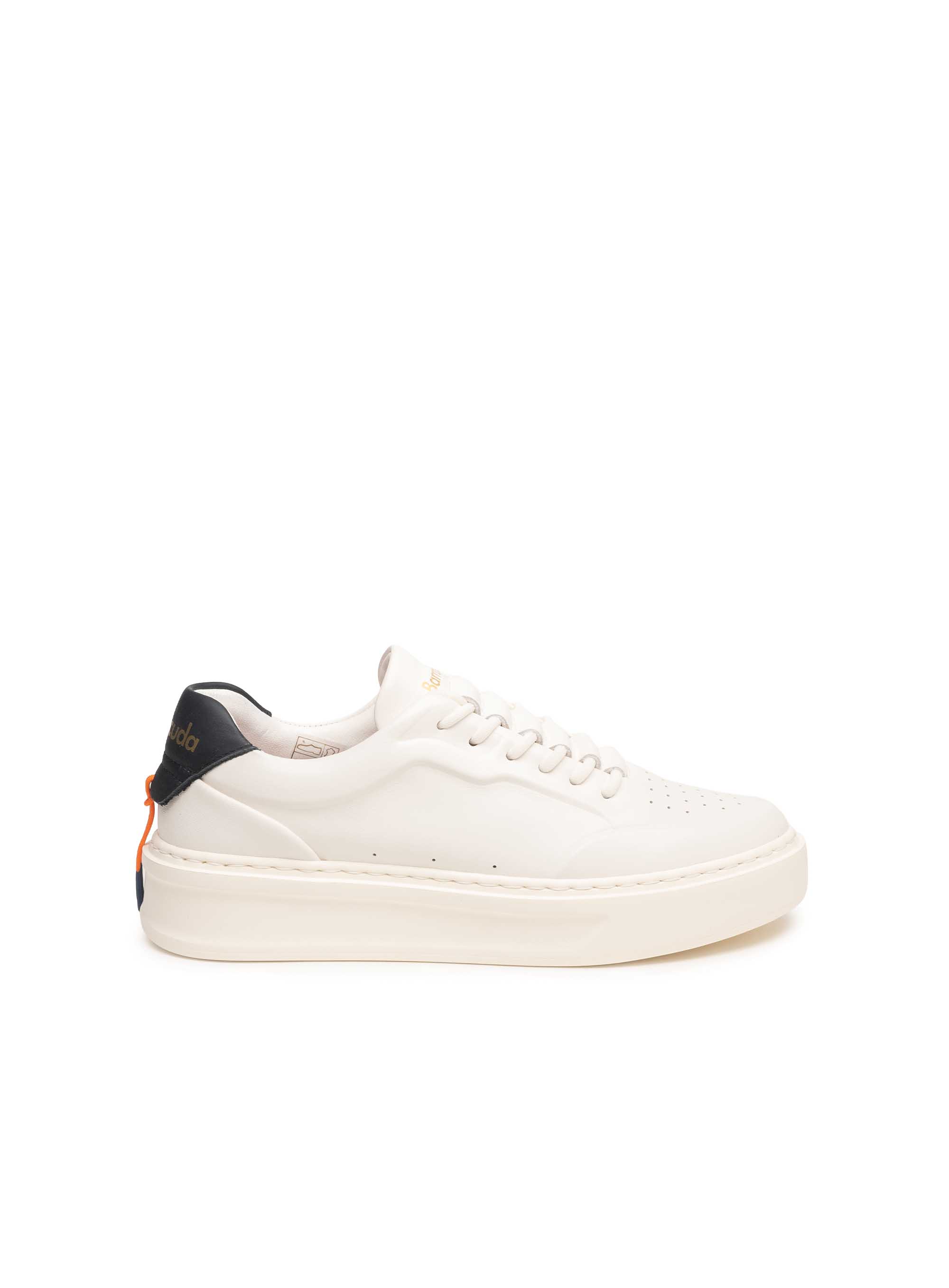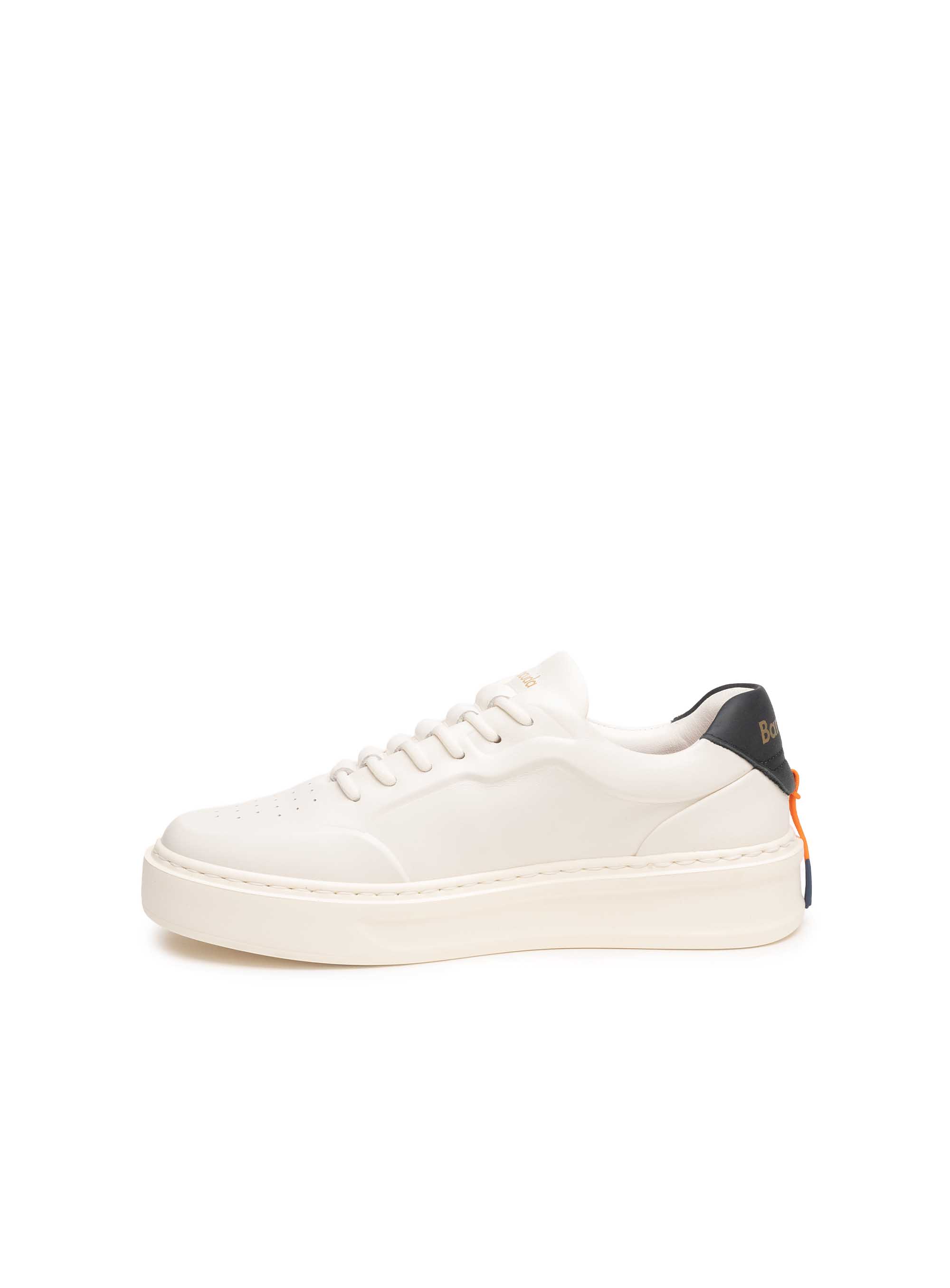 Minimalističke bijele tenisice izrađene od glatke kože, dizajnirane za moderan i elegantan svakodnevni stil. Model ima čistu siluetu s perforacijama na prednjem dijelu za bolju prozračnost te povišeni gumeni potplat koji pruža dodatnu udobnost i suvremen izgled. Kontrastni crni detalj na peti s diskretnim logotipom i narančasti ukrasni element daju suptilan, prepoznatljiv naglasak. Idealne za ležerno-poslovne i casual kombinacije.