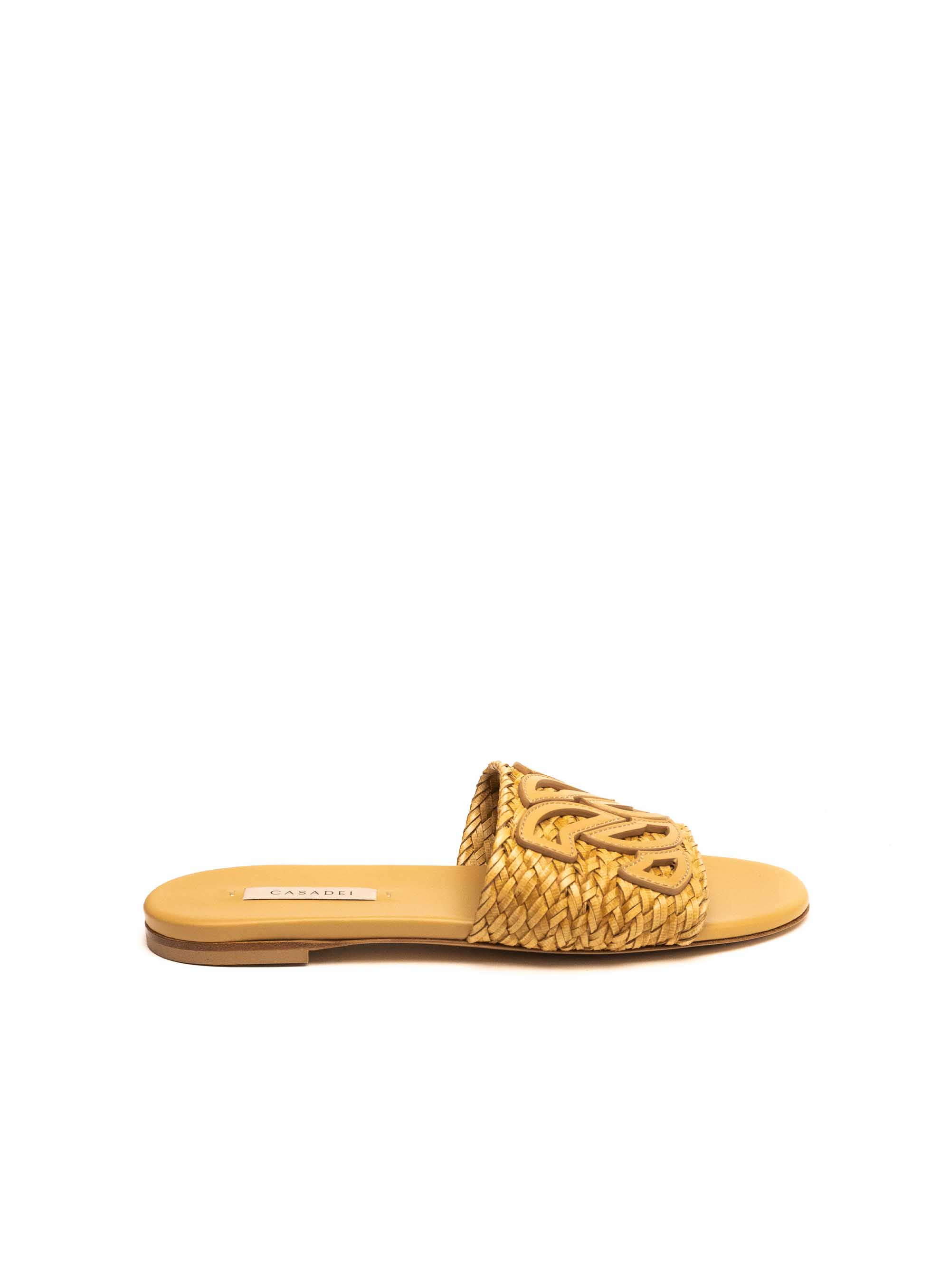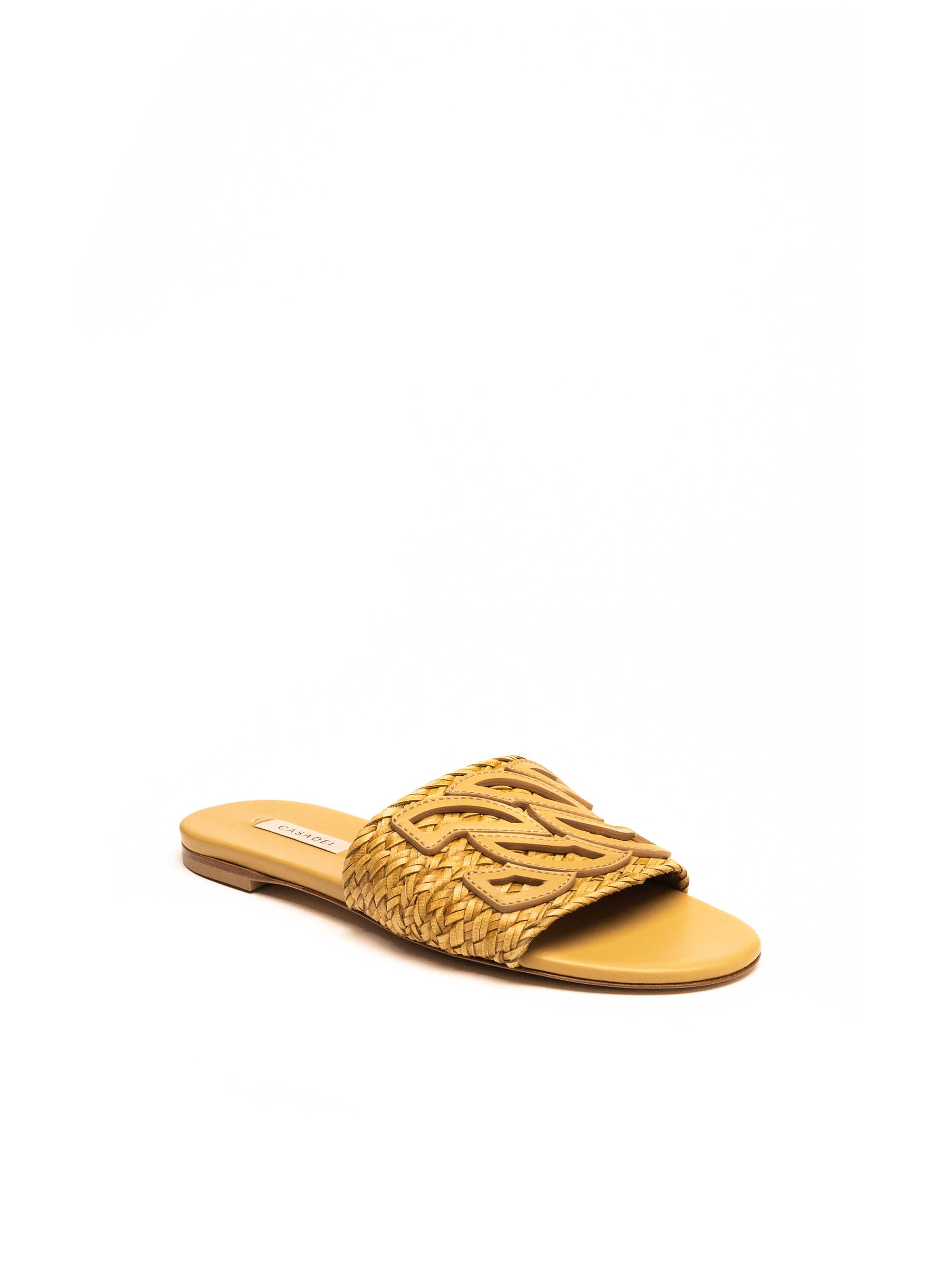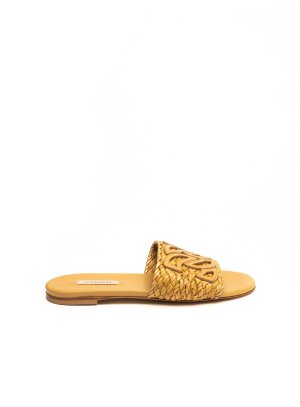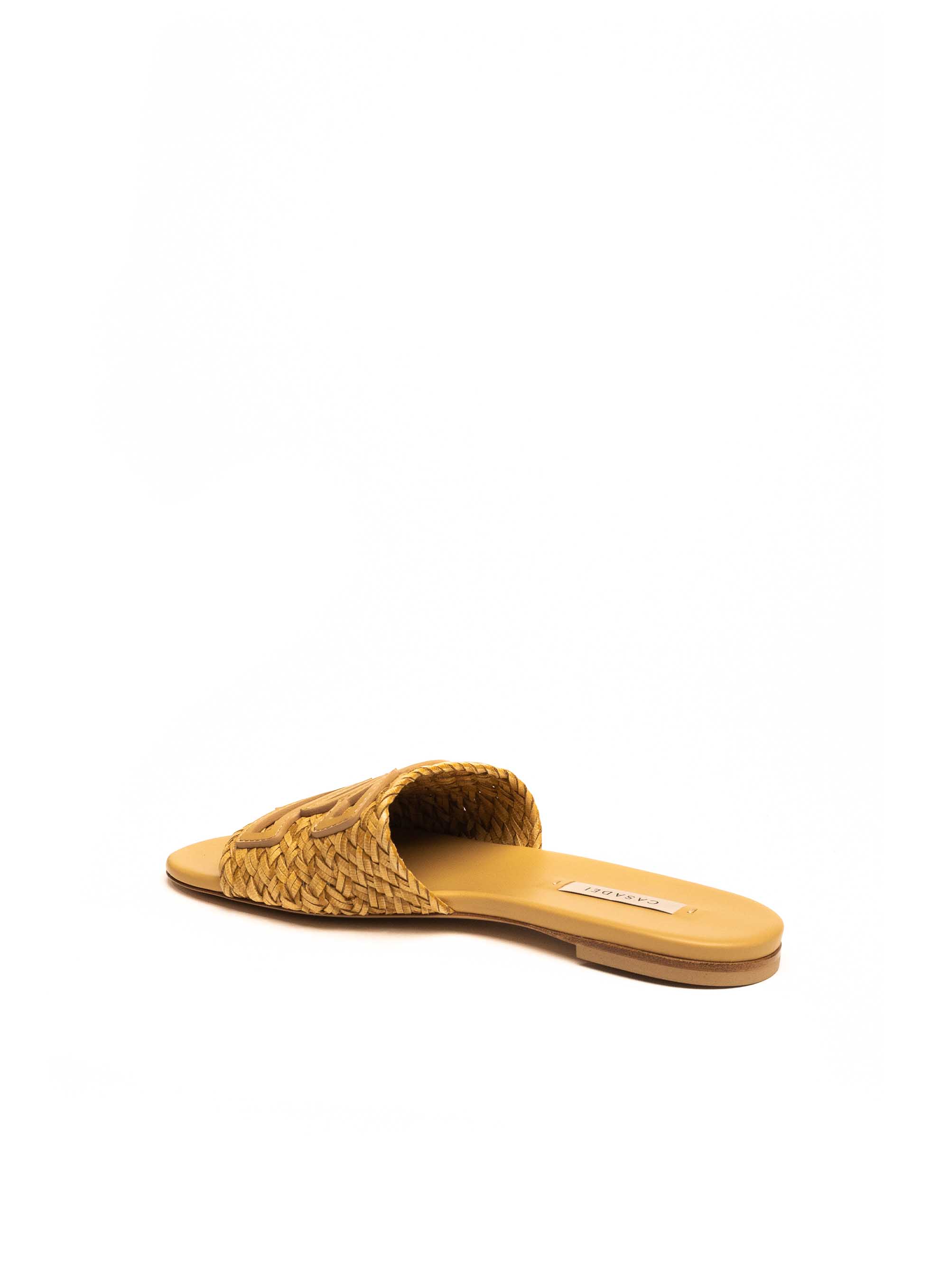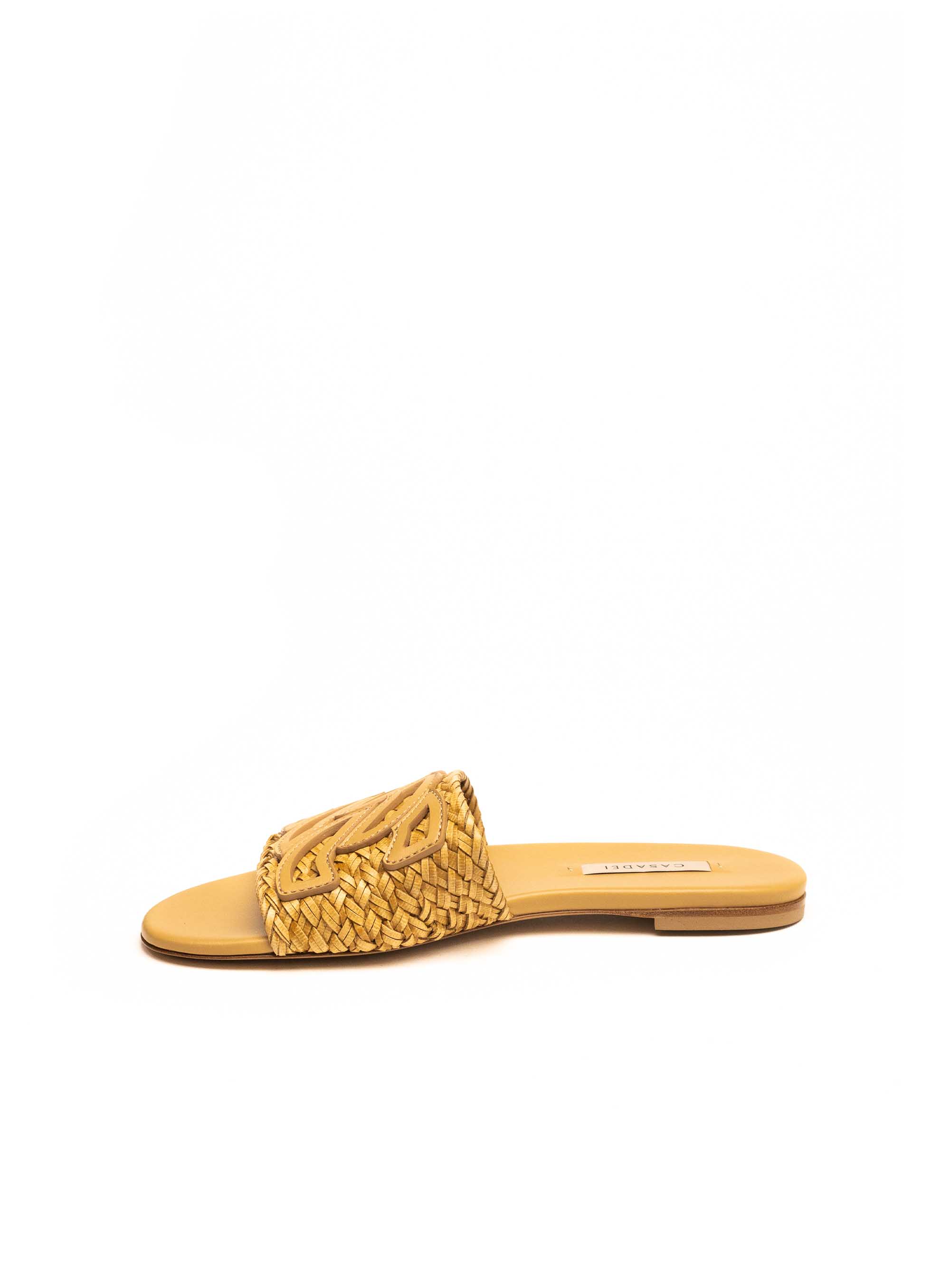 Elegantne Casadei natikače u toploj zlatno-bež nijansi donose spoj luksuza i ljetne ležernosti. Izrađene od pletene kože, ističu se bogatom teksturom i dekorativnim logotip detaljem koji naglašava sofisticiran izgled. Ravni potplat osigurava udobnost i lakoću pri svakodnevnom nošenju.