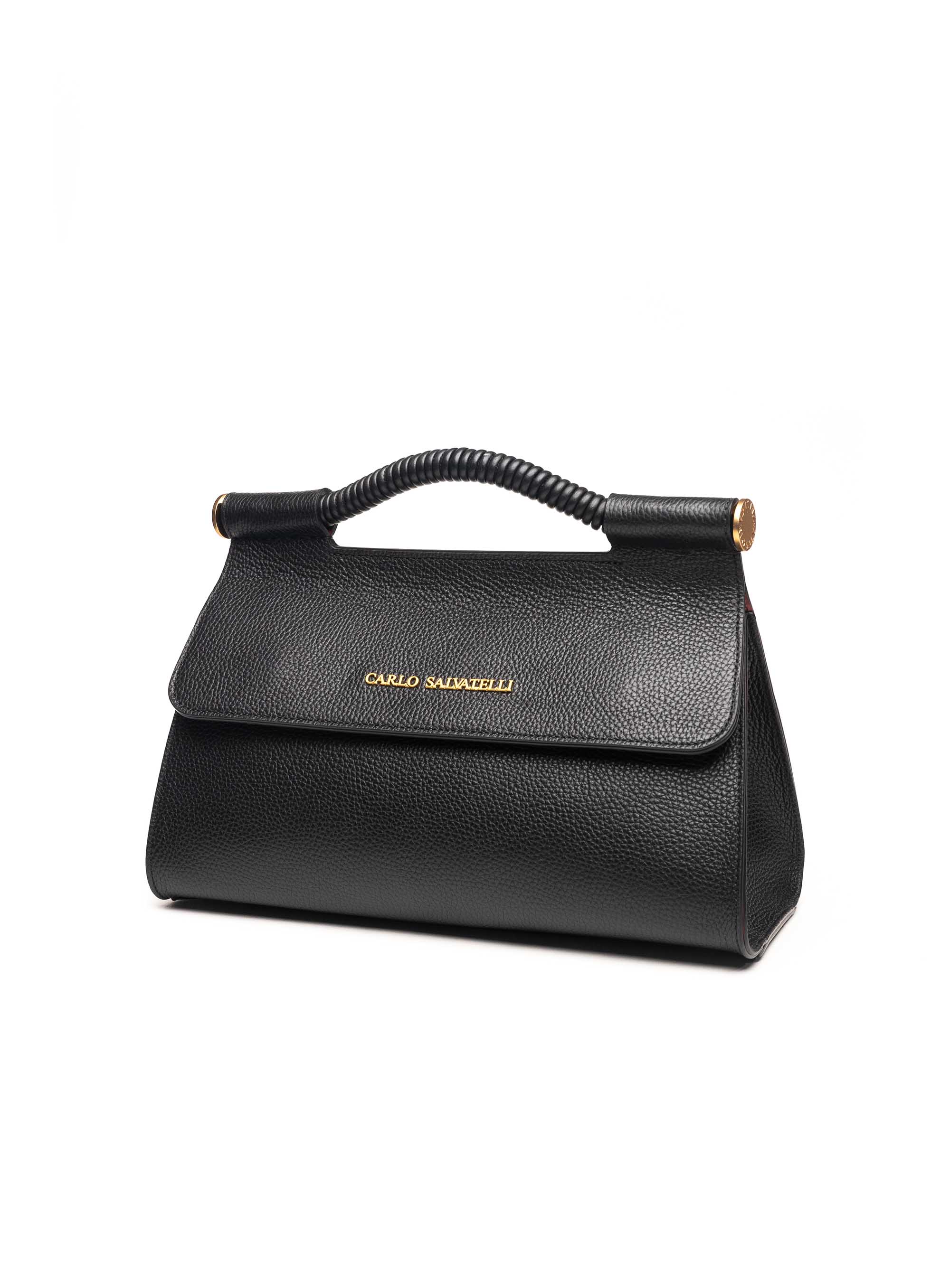 Elegantna Carlo Salvatelli torba u klasičnoj crnoj nijansi izrađena je od kvalitetne teksturirane kože koja pruža luksuzan izgled i dugotrajnost. Minimalistički dizajn naglašen je preklopnim zatvaranjem i diskretnim zlatnim logotipom na prednjoj strani, dok ručka s reljefnom teksturom dodatno ističe moderan i sofisticiran karakter modela.