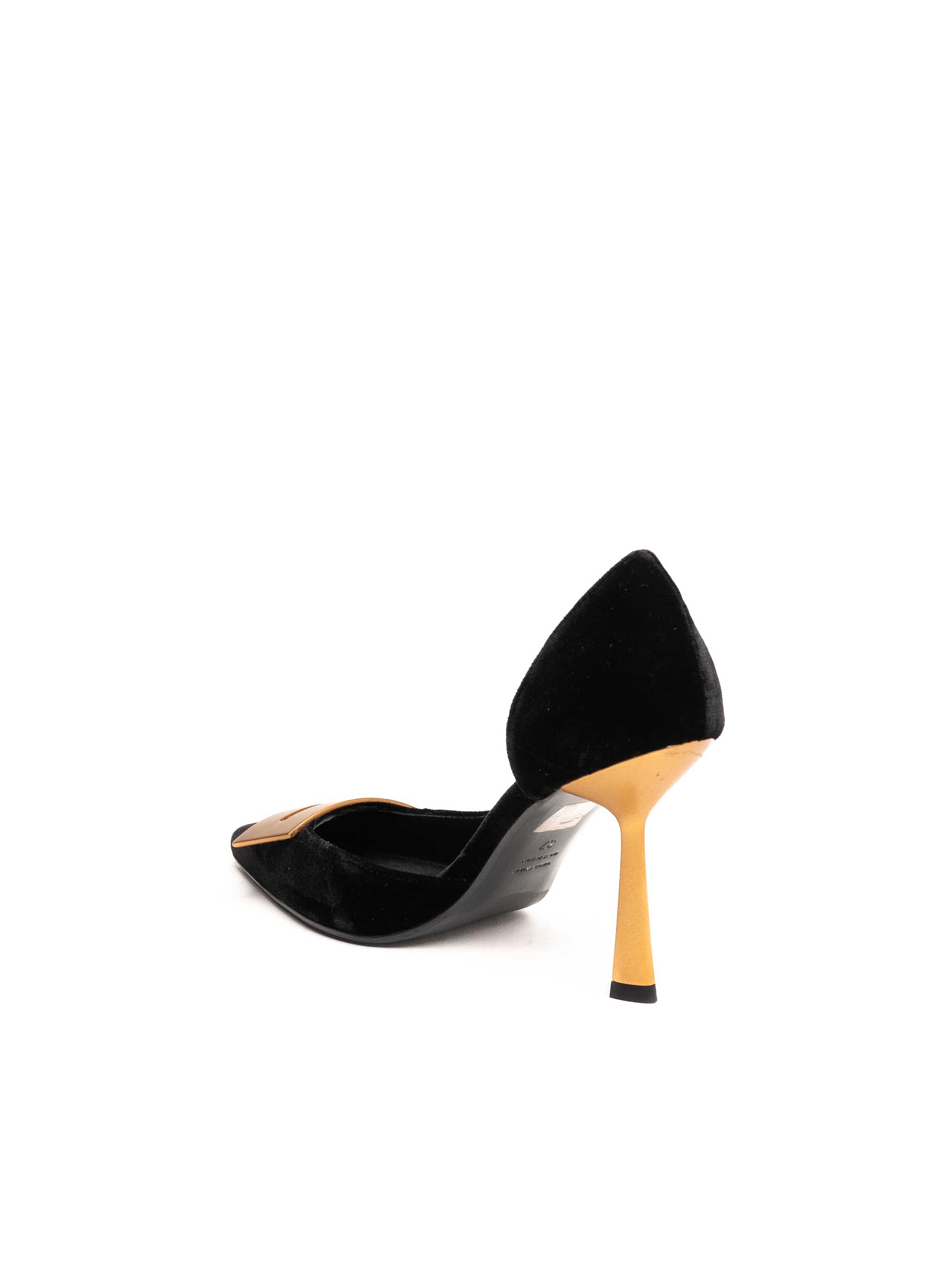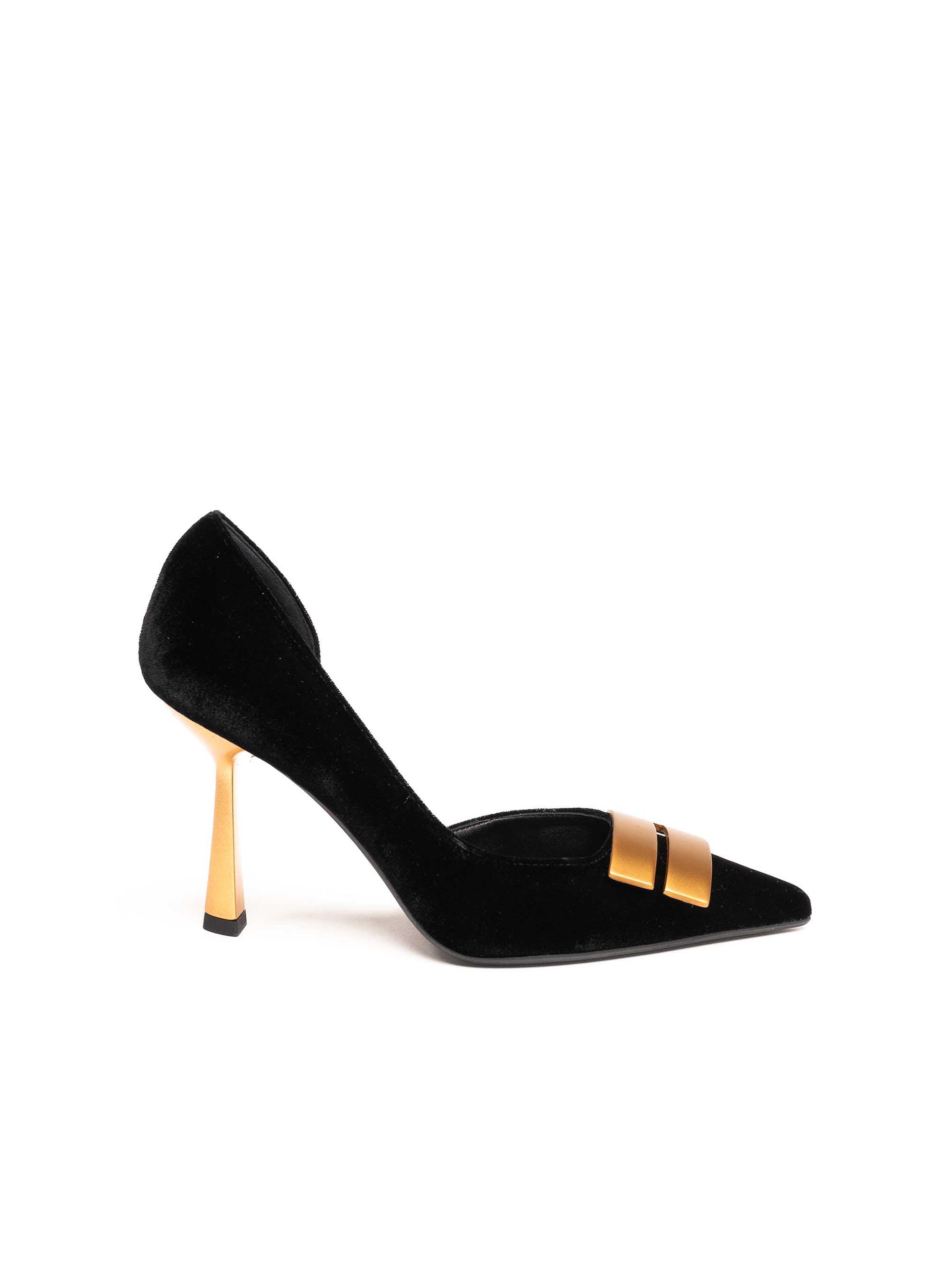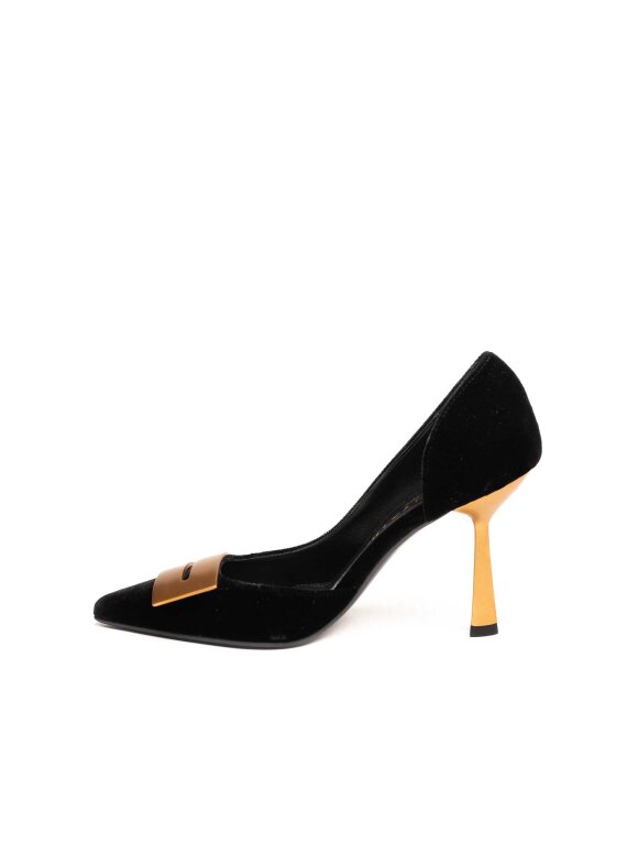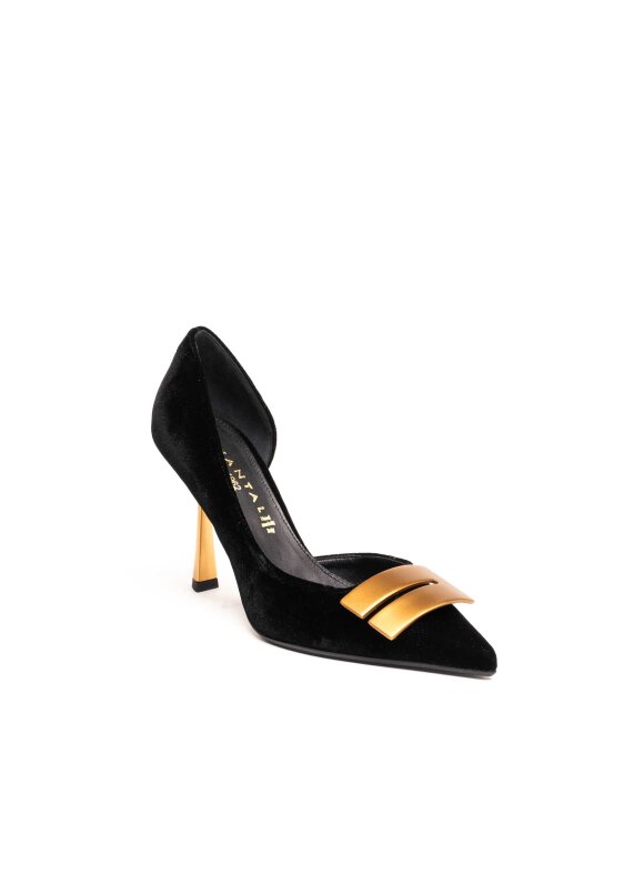Crne salonke izrađene od luksuznog baršuna odišu elegancijom i sofisticiranošću. Model krasi prepoznatljiva zlatna potpetica i dekorativna zlatna kopča na špicastom vrhu, koji dodatno naglašavaju profinjen dizajn. Visoka tanka potpetica pruža ženstven i graciozan izgled, dok kontrast baršuna i metalnih detalja čini ove salonke savršenim izborom za večernje prilike i posebne događaje.